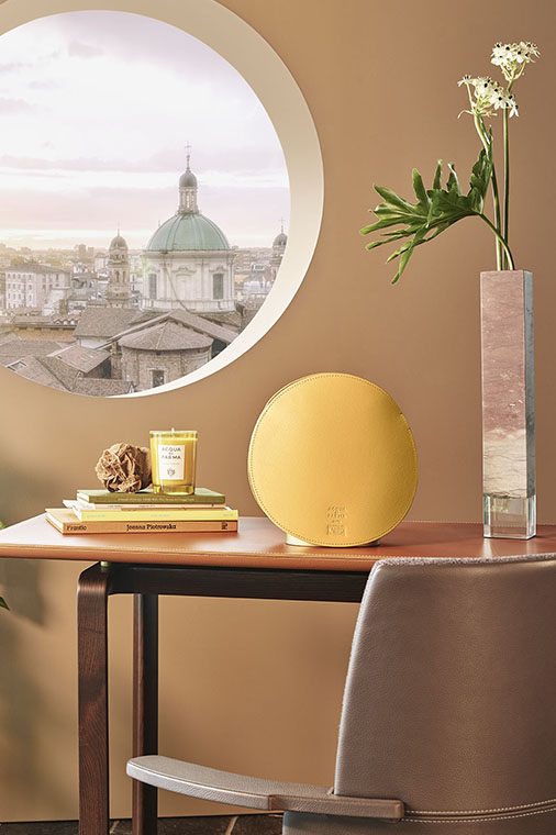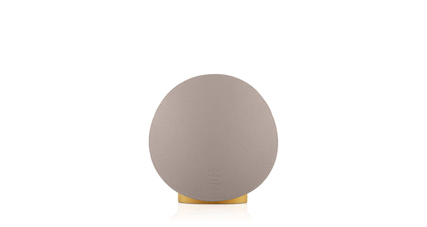 Airound?自動香氛器由二人組合GamFratesi設計,由兩個元素組成:主體,從中擴散香氣;圓形香氛罩,採用精美的PelleFrau?軟皮製作,有四種不同的顏色以及Cuoio Saddle Extra皮革版本可選。設計線條極為流暢,由兩塊軟皮或皮革圓盤組成,帶有對比色縫線和同色系染色邊緣。一個半柔性塑膠材質的支撐,用以確保穩定性。
