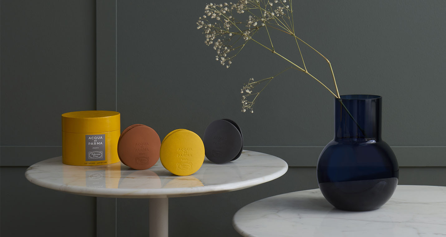 香氛罩有黃色、深灰色和棕色可選,這些顏色專為與灰色的內部主體和諧搭配而設計。在圓盤中央燙印有""Acqua di Parma meets Poltrona Frau""徽標。套件中所帶的入門套裝包括三種香氛:Milano(米蘭)、Buongiorno(早晨好)和Luce di Colonia(晶瑩花露)。