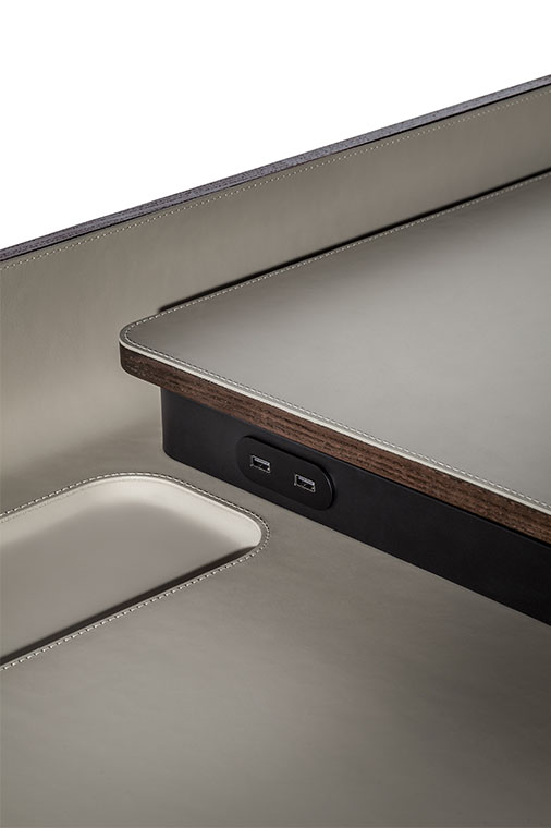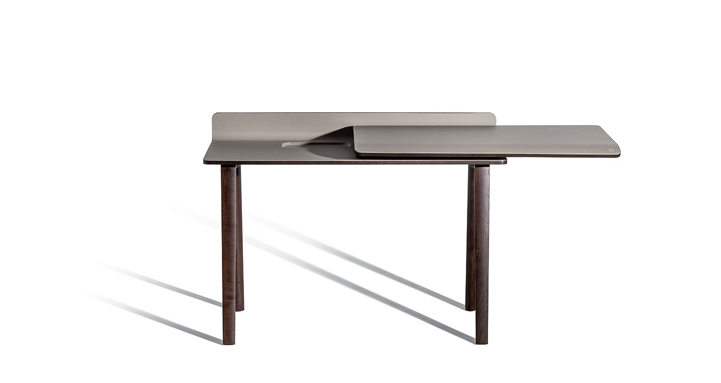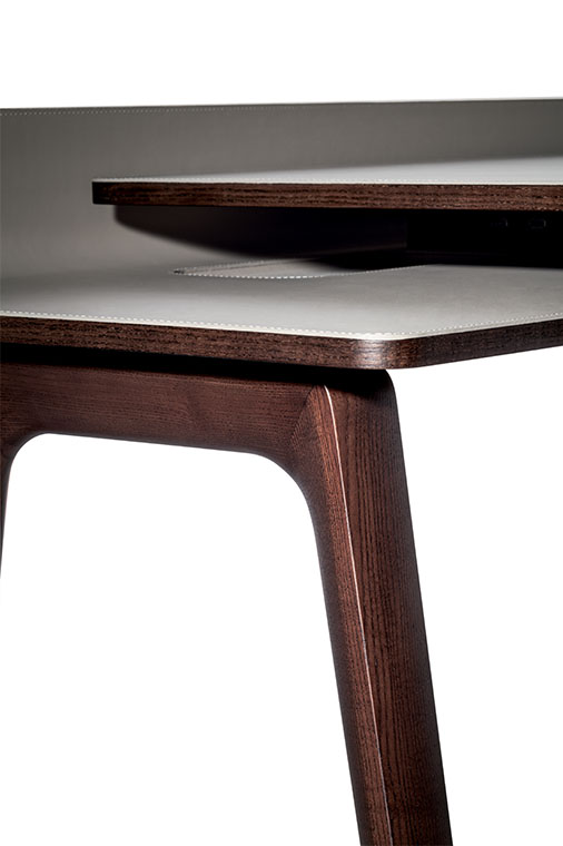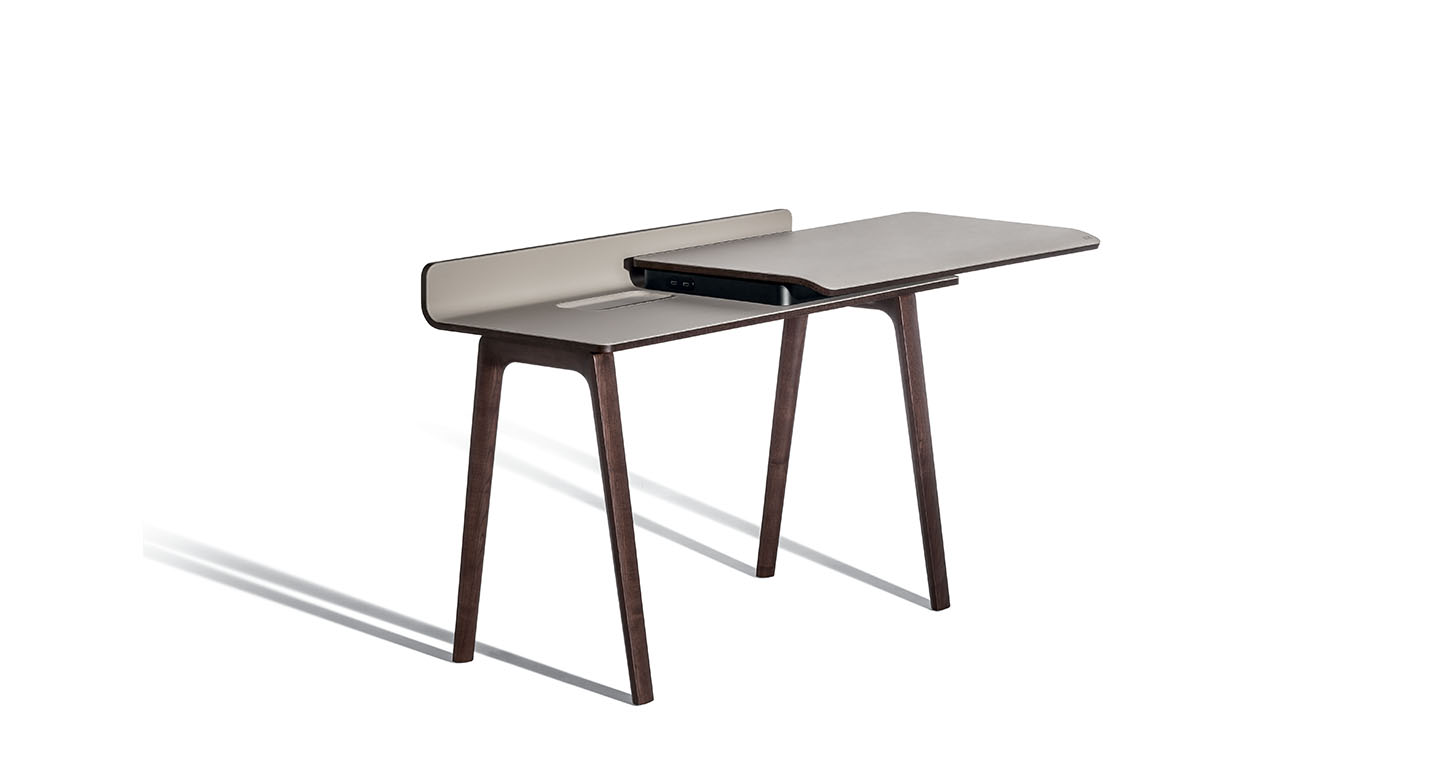 Poltrona Frau的Iren寫字臺包括獨立式版本,其檯面架在畫架式白蠟木實木基座上;另外還有壁掛式,安裝在銷桿上。訂購時,客戶可以選擇向左或向右滑動。