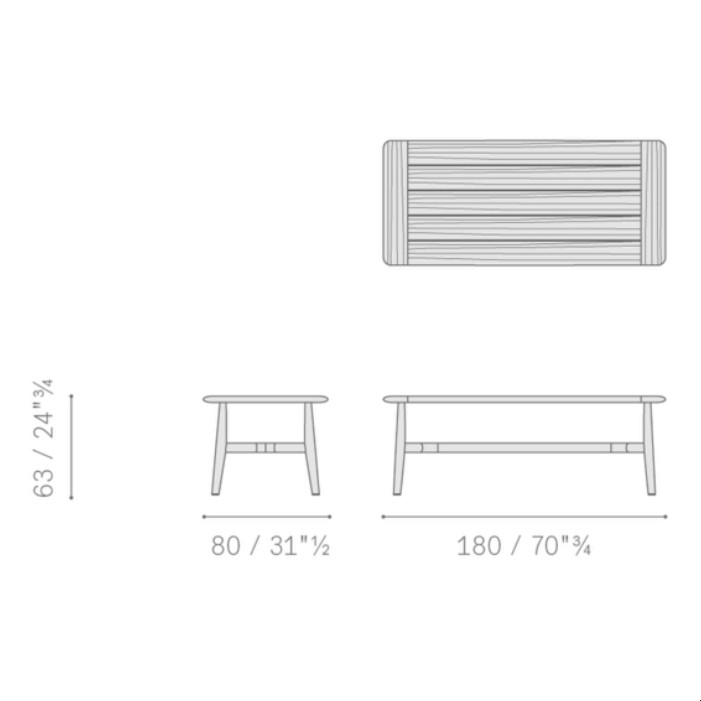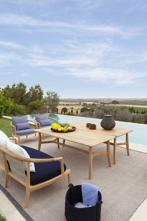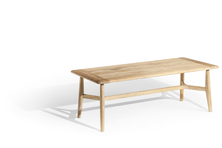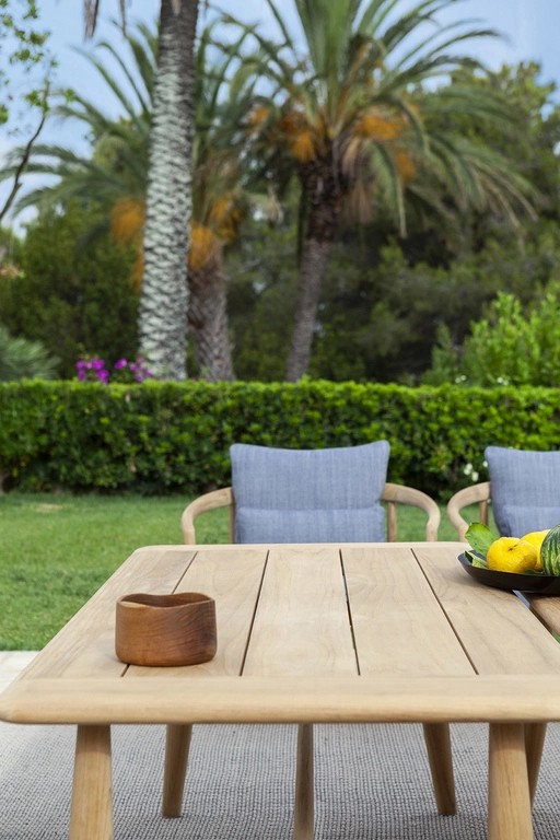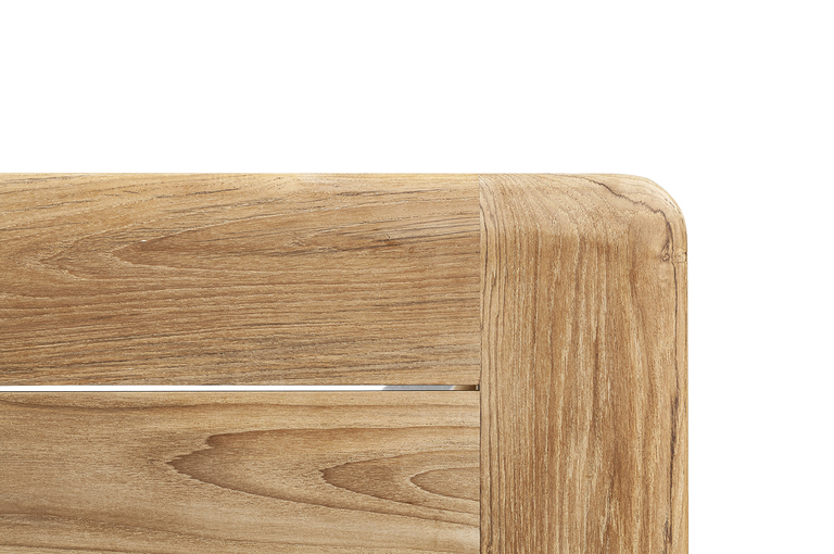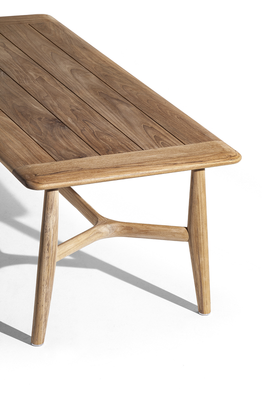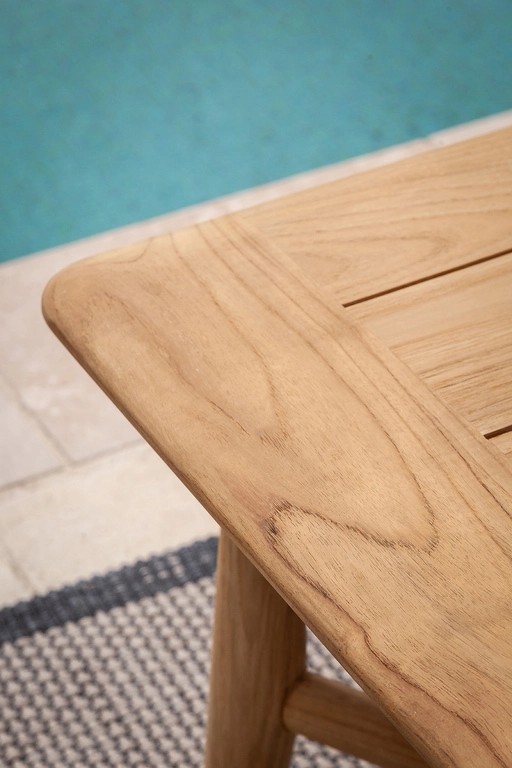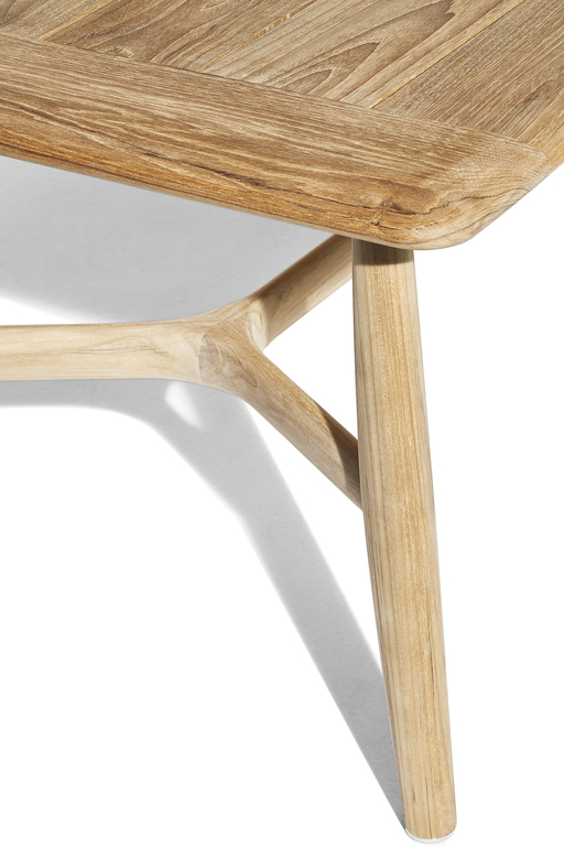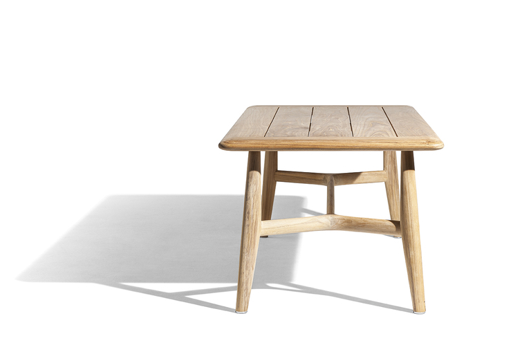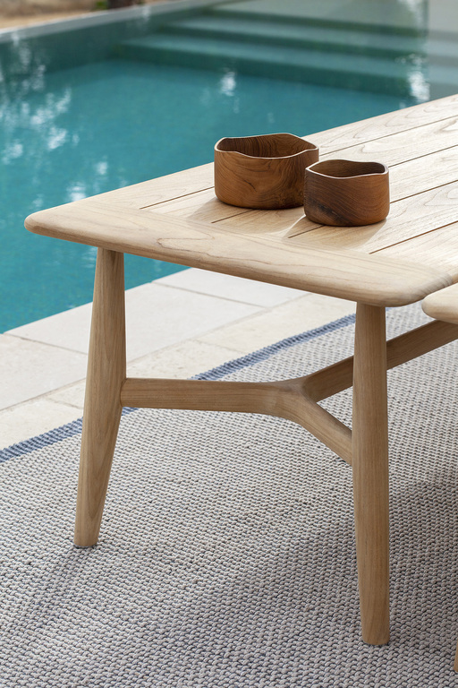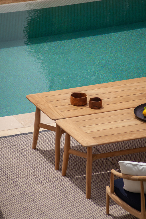 Designed for a more informal dining experience, the outdoor table is generously sized and low in height to match the ergonomic seating of the two-seater sofa and armchairs from The Secret Garden outdoor furniture collection, designed by Roberto Lazzeroni. The frame and top are made of solid teak wood in a natural finish. The top has a staved pattern that reflects a typical motif of older nautical eras. Part of the range offered by Poltrona Frau Boundless Living Outdoor Collections.