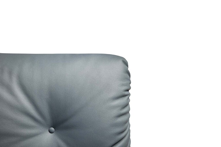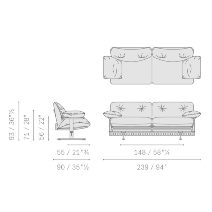 The steel frame is airy and slender. The “T”-shaped beam is separated from the crossbars that support the seat in such a way that the padded part of the sofa appears to float in the air. The load-bearing beam, free of joints, is connected by aluminium profiles in a sophisticated play on interconnections that are clearly visible from the side. The high-tech aesthetic of the metal parts, all of which are finished with matt black epoxy powder paint, contrasts with the warmth and softness of the cushions.