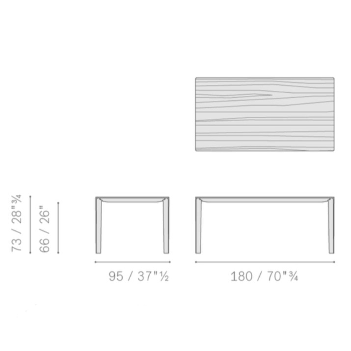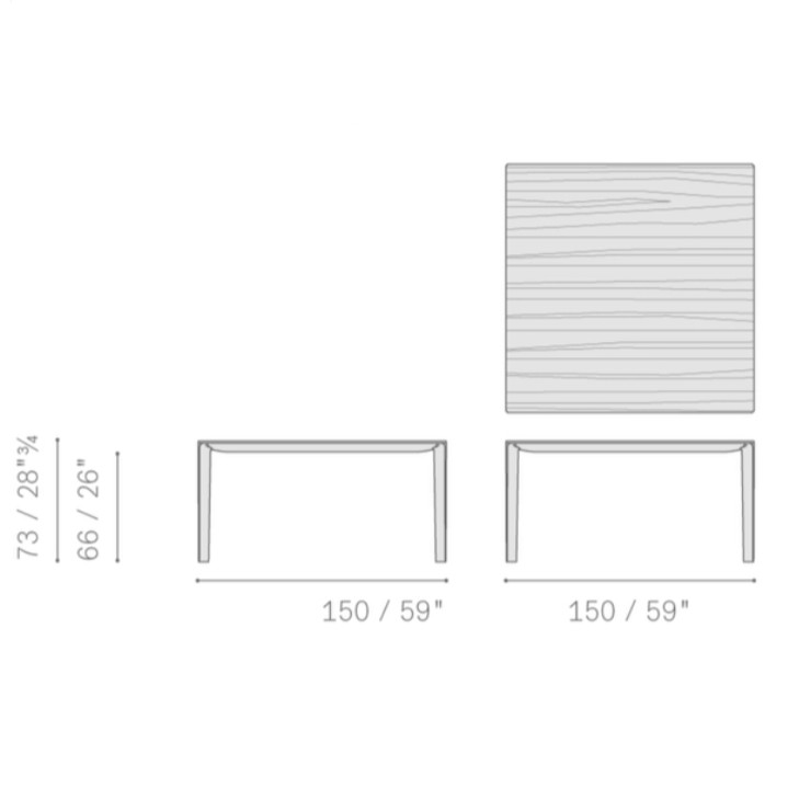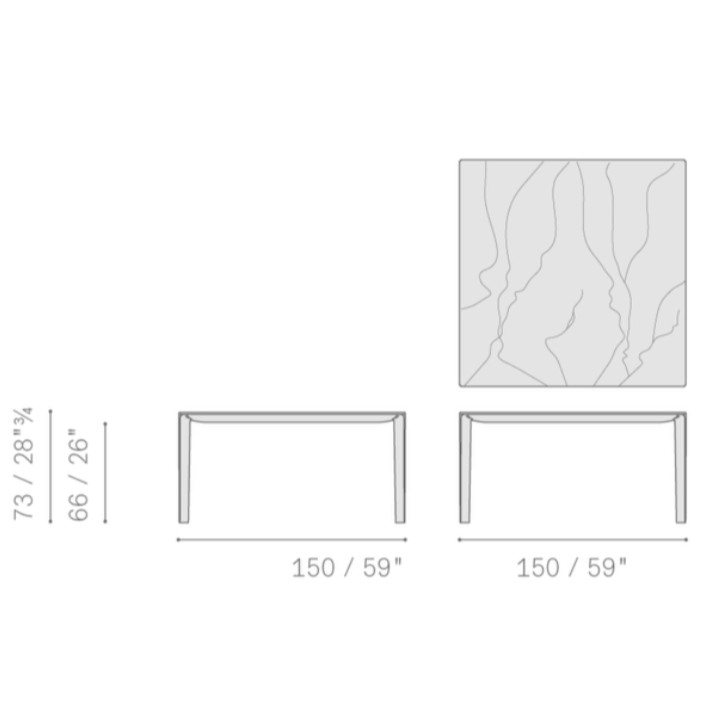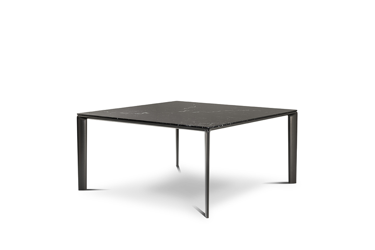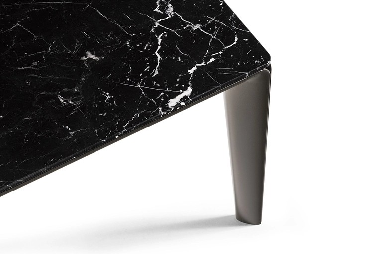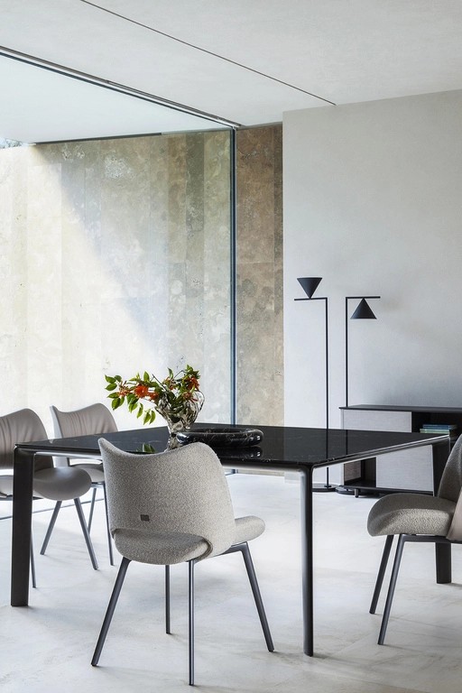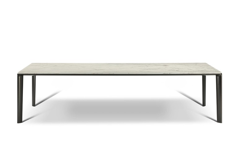 The Homey dining table designed by GamFratesi aims to shine a renewed light on the value of the home and emphasize the centrality of its role in domestic settings that are increasingly attentive to sharing. This designer table is compact and graphic, characterised by light but volumetric lines, enriched by fine and expertly worked materials. The quintessence of Homey is expressed in its die-cast aluminium legs. In a sculptural play reminiscent of haute couture, the two leg flaps fold and join together without touching, creating a chiaroscuro effect in the centre. A refined stylistic exercise that recalls the workmanship of leather, Poltrona Frau's material of choice. The lines of the two flaps open slightly at the top to transform into the shelf that supports it.