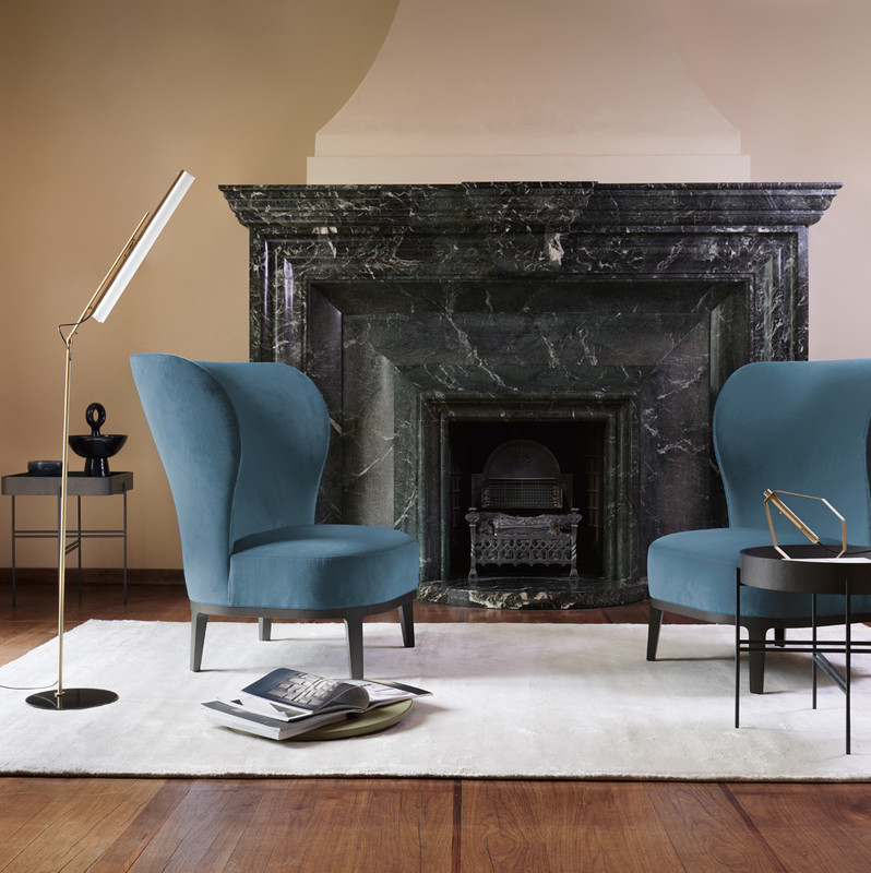 Wing chair, sofa, pouf, and coffee tables compose the Spring collection.