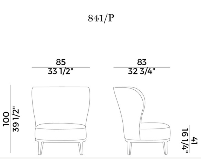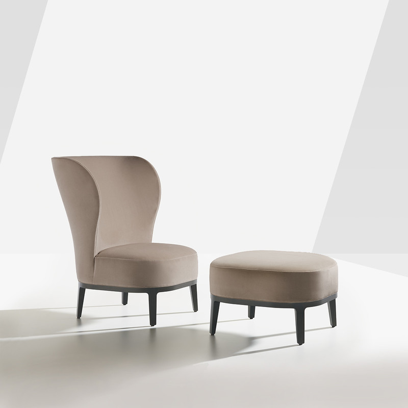 The armchair has a thick padding in fire retardant polyurethane foam, with a choice of upholstered fabrics or leathers as per collection and a solid beech frame.