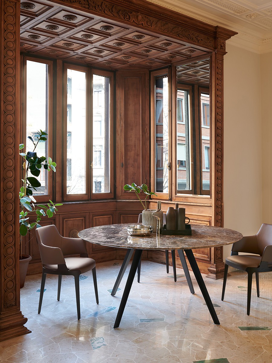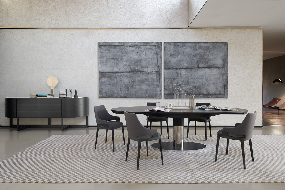 Swivel tub chair with seat and backrest padded in fire retardant polyurethane foam. Seat details in solid ash wood or Canaletto walnut and four-star swivel base in embossed black painted metal. Finishes and coverings as per collection.