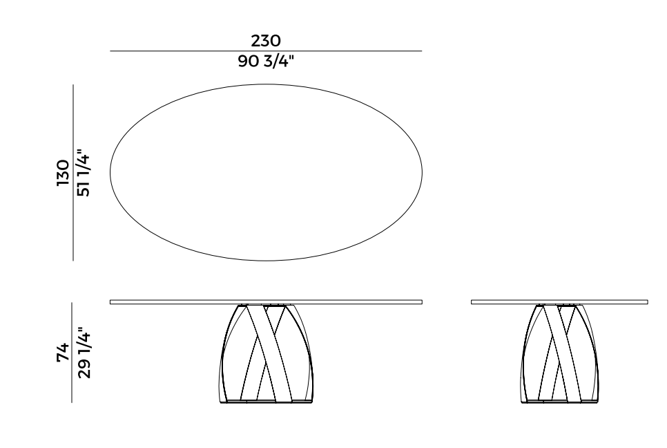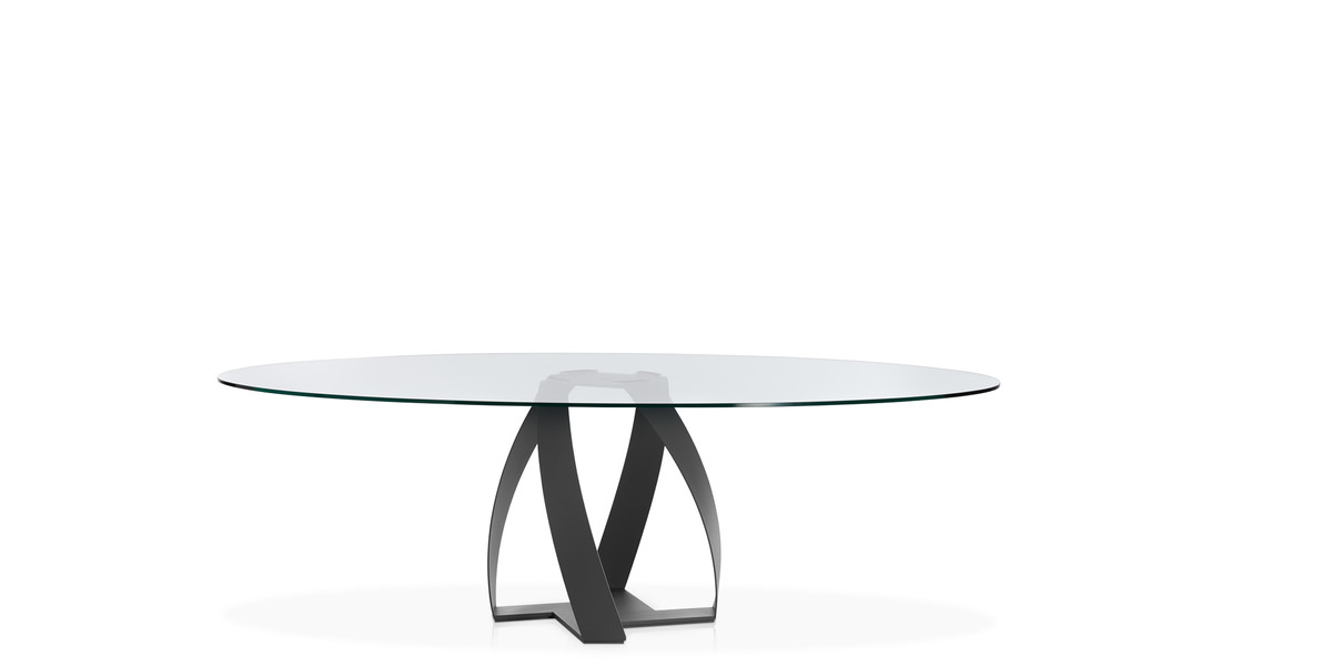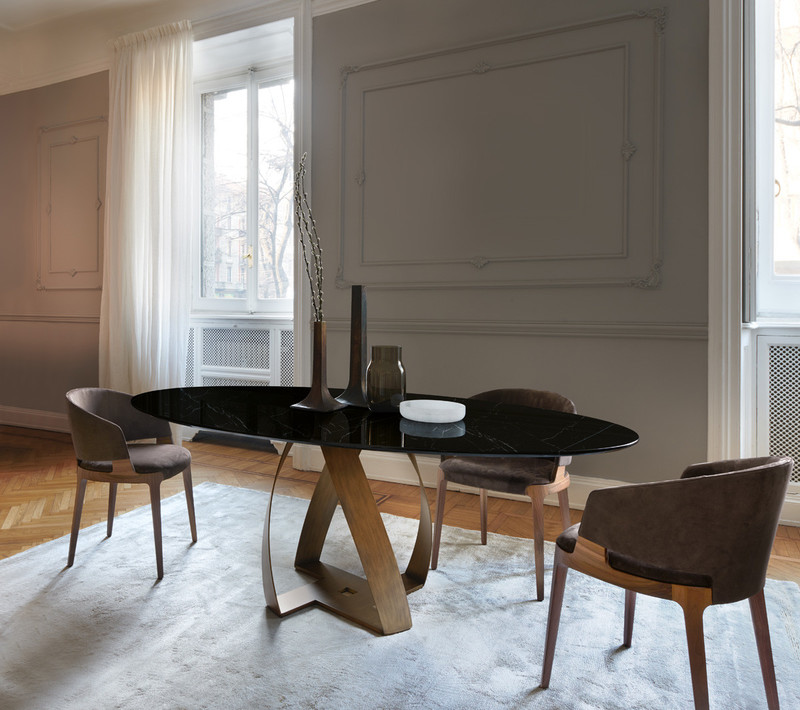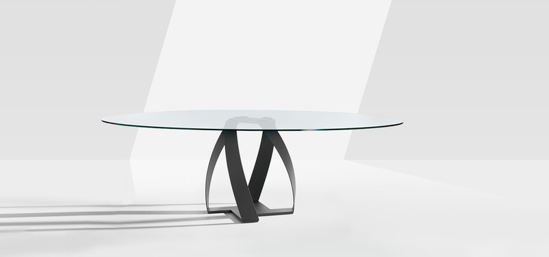 Table with round base and oval top in Canaletto walnut, marble or transparent tempered glass. Materials as per collection.
