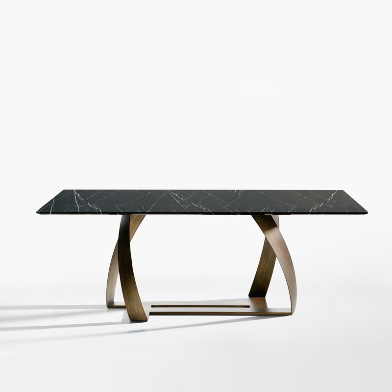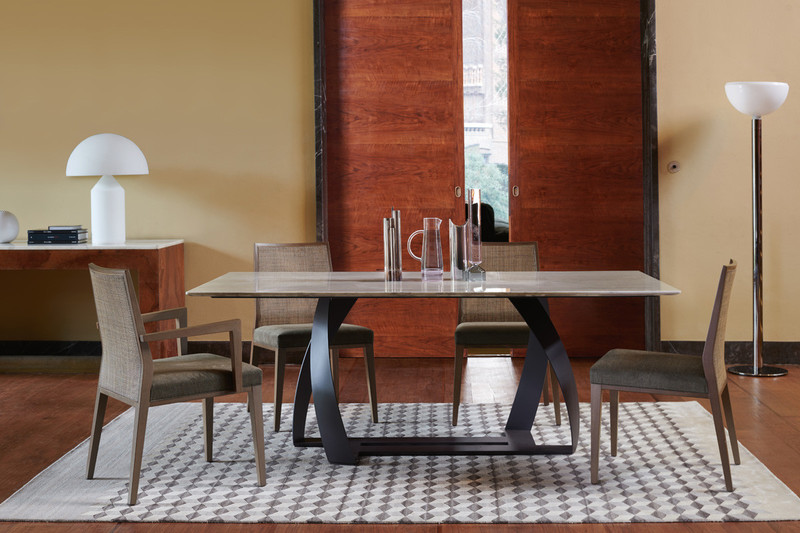 Table with elongated base and rectangular top in Canaletto walnut, marble or transparent tempered glass. Materials as per collection.