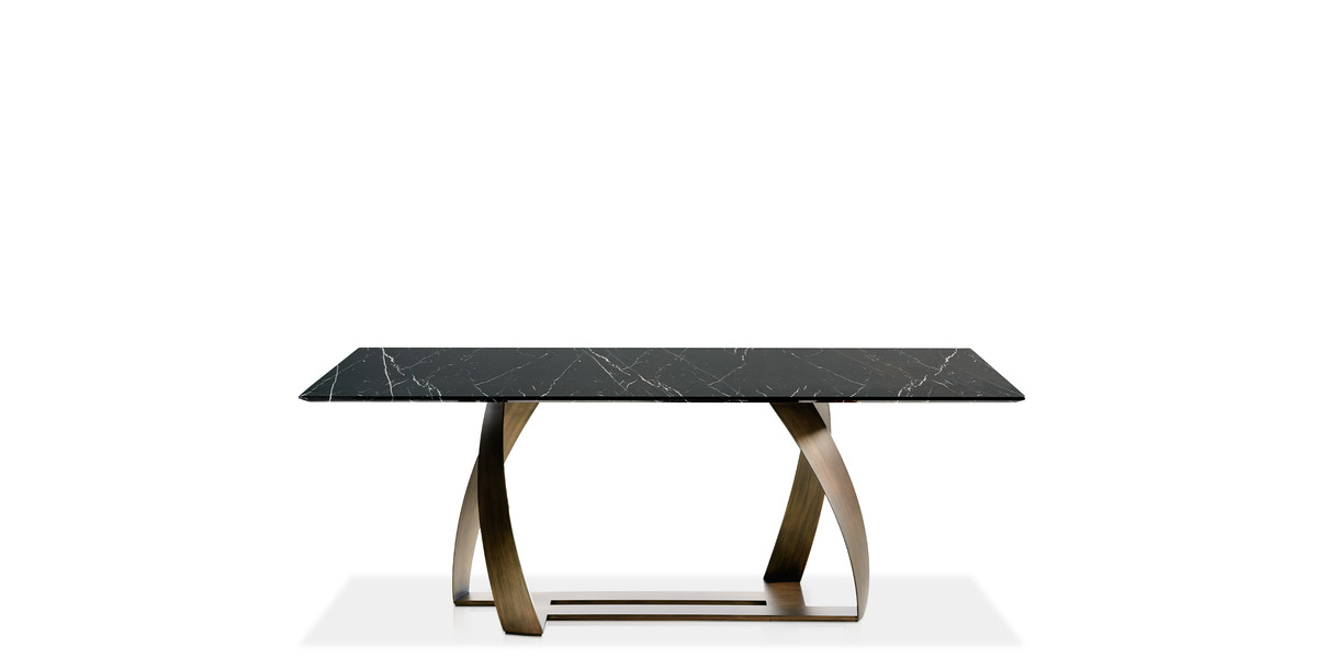 The design with intertwined bands of the metal base is the element that characterizes the Bon Bon tables and coffee tables’ family.