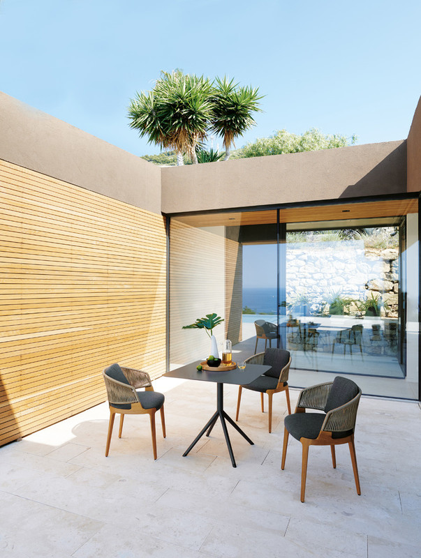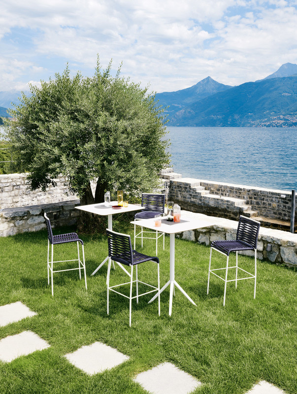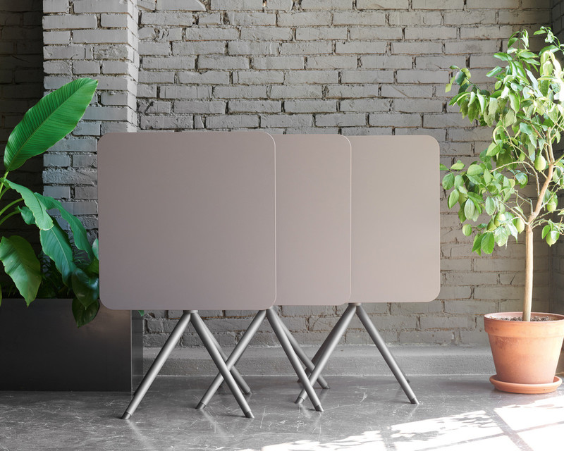 Katana is a table designed to adapt to both domestic interiors and open-air contexts, proposed in a version with four legs in embossed painted metal and rectangular top in laminated porcelain or HPL, in the finishes as per collection.