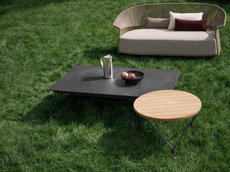 Weld is a family of coffee tables available in two heights and sizes composed of a painted metal base and nautical or “Gassa” rope details with a round top in HPL, laminated porcelain or solid Iroko wood.