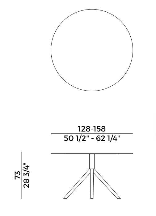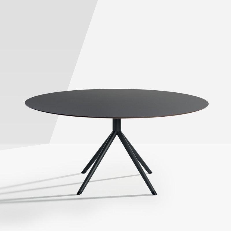 Versatile and with an essential design, the OTX table with central leg and four feet, is declined in the dining version ?128 e ?158cm, with painted metal base and HPL top in the finishes as per collection.