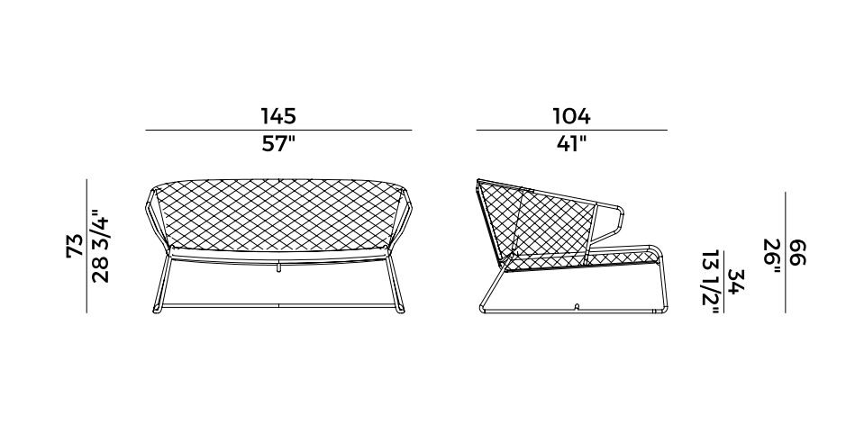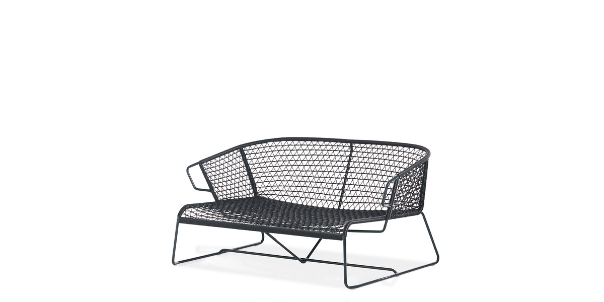 Characterized by a slender frame in painted metal tube with sled-shaped legs, and weaving in nautical or PVC rope, the Vela sofa represents the ideal piece of furniture for a veranda, the swimming pool or the garden