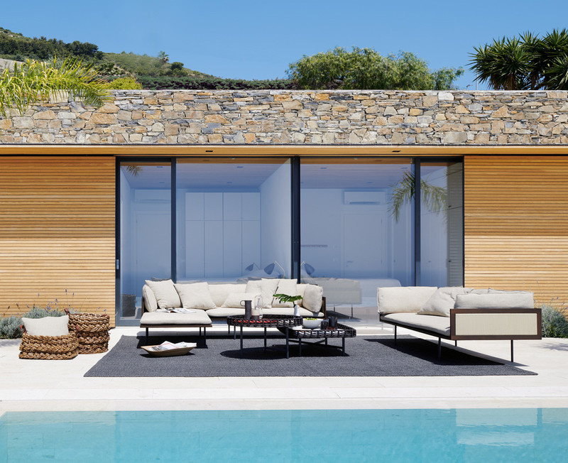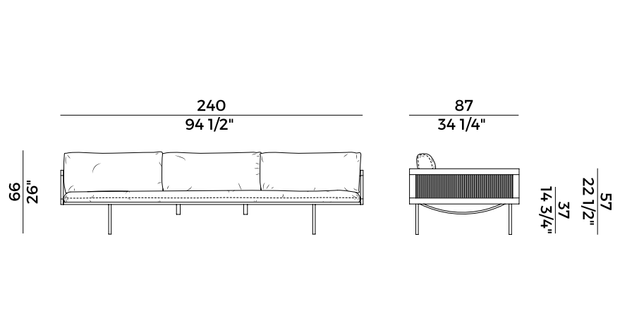 The Loom sofa has a solid mahogany wooden frame with "Gassa" rope or moka synthetic rope inserts and feet in anthracite embossed lacquered metal.