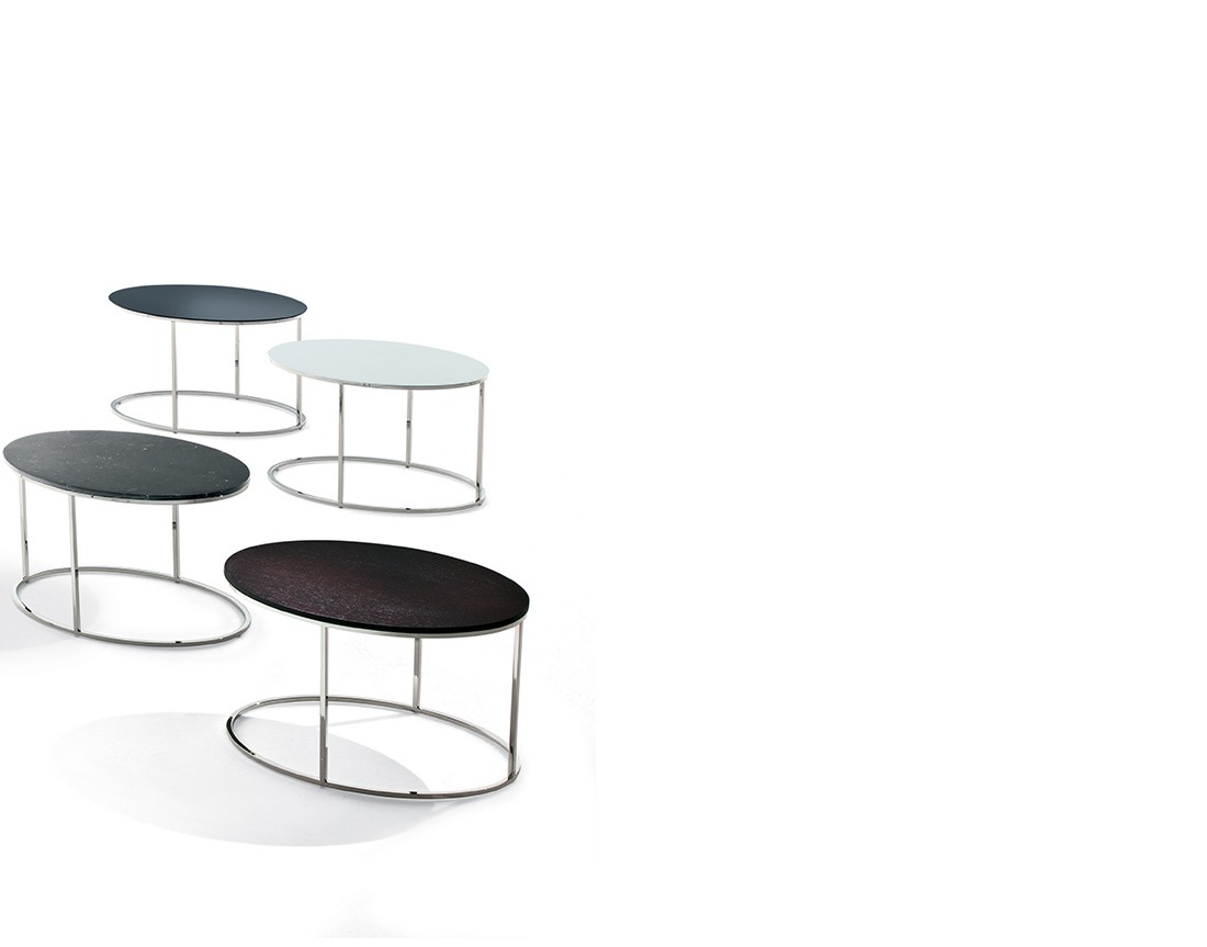 Tavolino di servizio con struttura in metallo cromato. Piano placcato frassino, in vetro verniciato (extra chiaro bianco, nero o moka) o in marmo lucido. Finiture disponibili: WG wengé, NC noce. TB tabacco, laccato opaco poro aperto ( L21 bianco, L29 madreperla, L23 cappuccino, L25 grigio fumo, L22 nero, L24 rosso ).