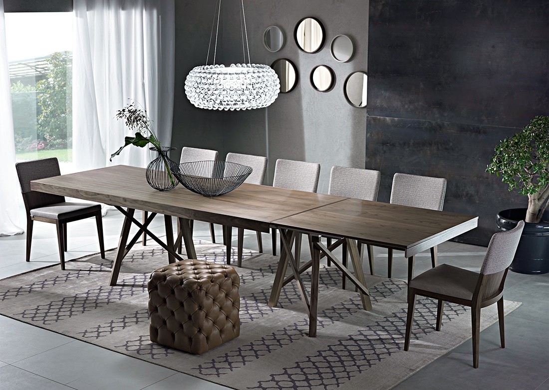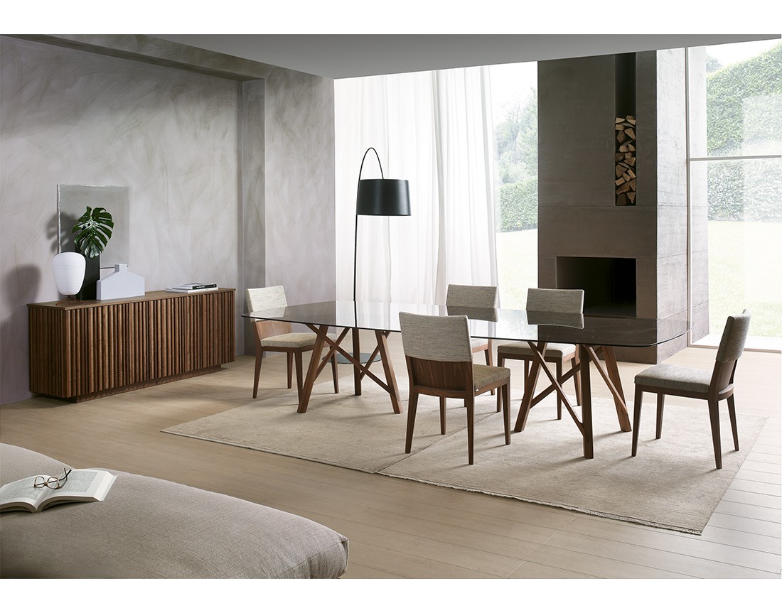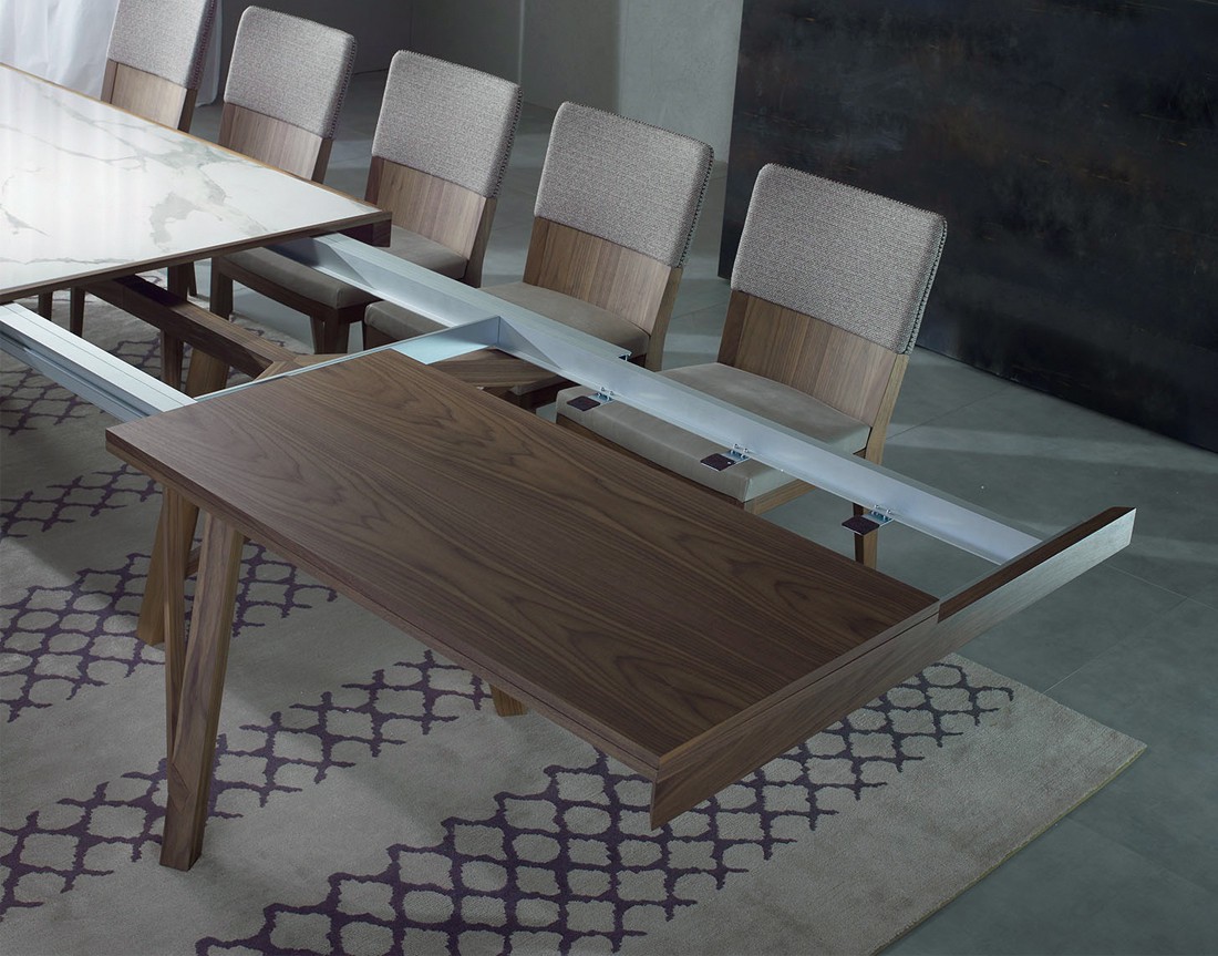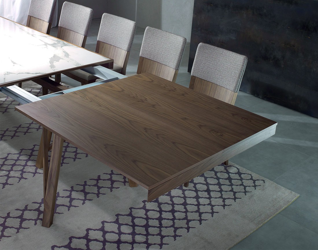 Tavolo da pranzo fisso o allungabile con basamento e struttura in massello di noce canaletto. Nella versione fissa, piano in legno, in vetro, in Cimento? (eco-cemento C02 sabbia, C03 tortora) o in Laminam? (ceramica effetto marmo). Nella versione allungabile, piano in legno, in vetro verniciato (extra chiaro bianco, nero, moka) o in Laminam? (ceramica effetto marmo) con meccanismo autocentrante in alluminio e prolunga interna placcata noce canaletto. Finiture disponibili: WG wengé, NK noce canaletto.