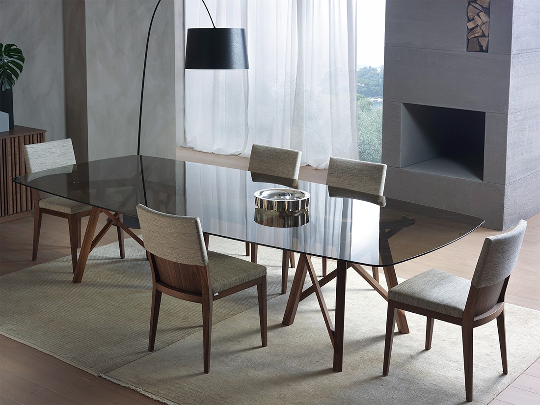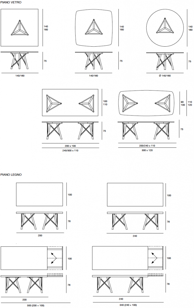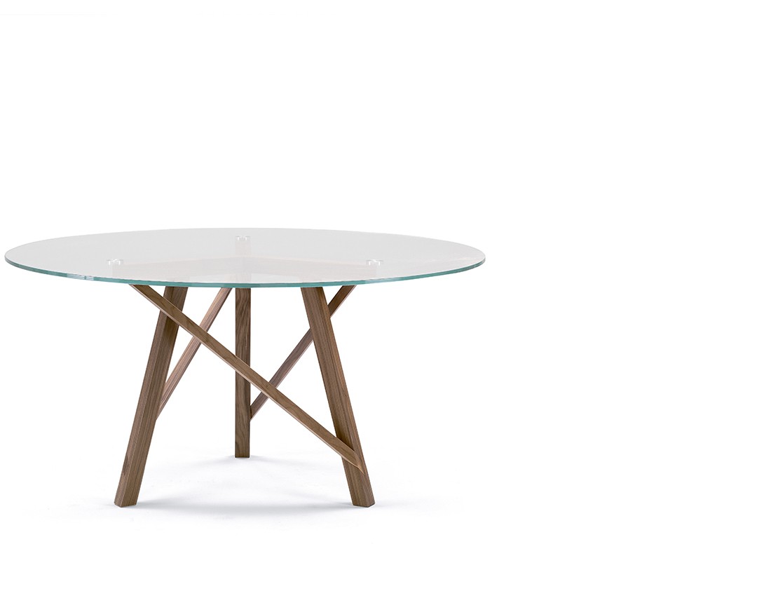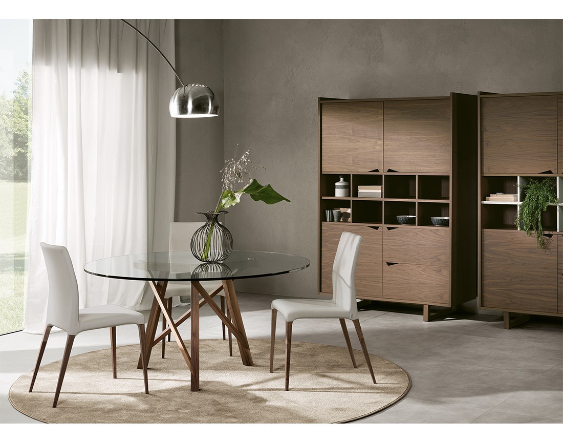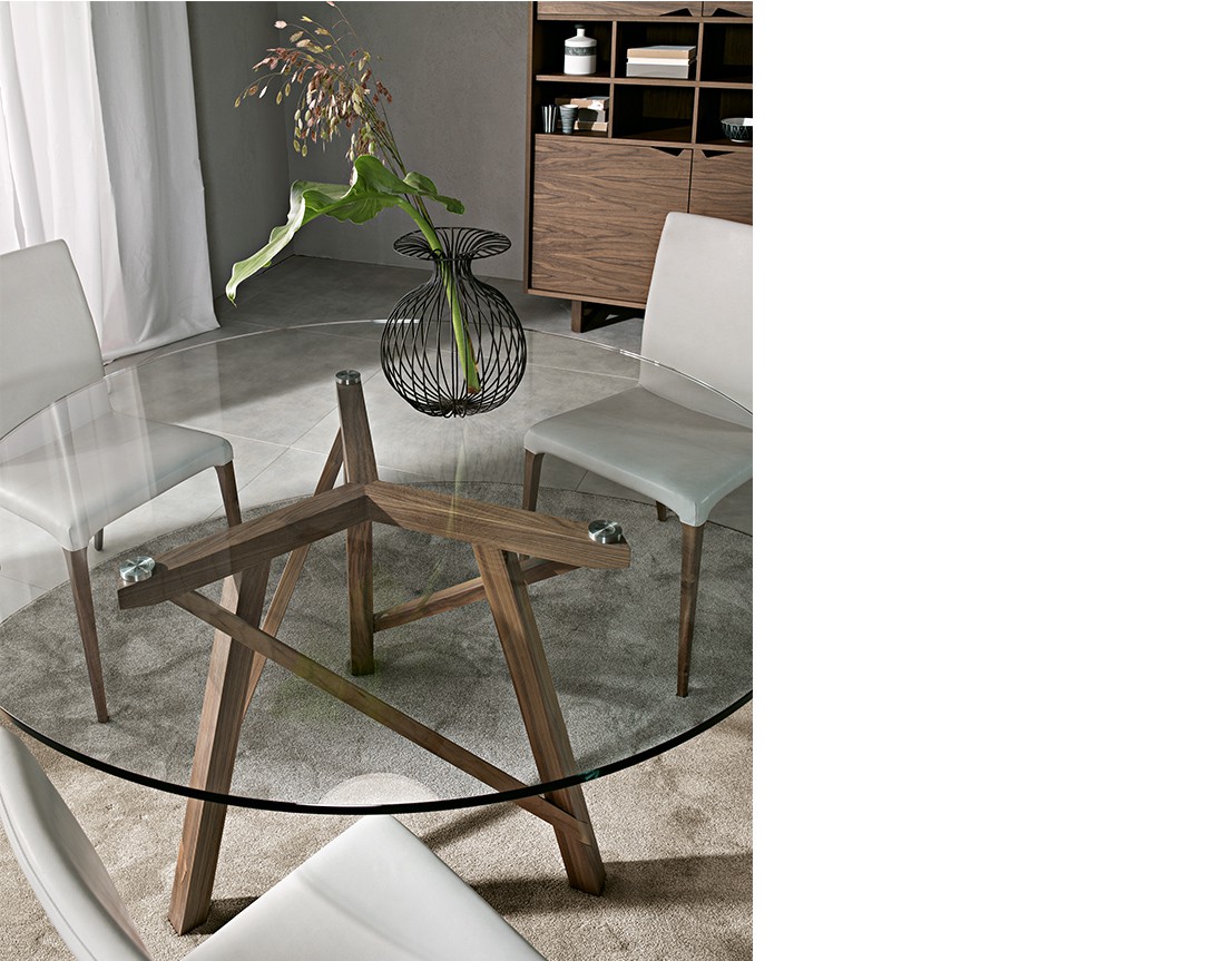 Tavolo da pranzo fisso o allungabile con basamento e struttura in massello di noce canaletto. Nella versione fissa, piano in legno, in vetro, in Cimento? (eco-cemento C02 sabbia, C03 tortora) o in Laminam? (ceramica effetto marmo). Nella versione allungabile, piano in legno, in vetro verniciato (extra chiaro bianco, nero, moka) o in Laminam? (ceramica effetto marmo) con meccanismo autocentrante in alluminio e prolunga interna placcata noce canaletto. Finiture disponibili: WG wengé, NK noce canaletto.