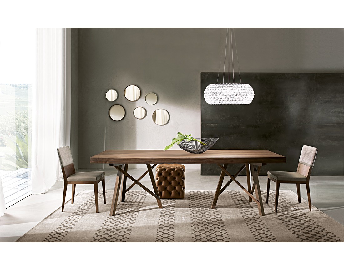 Zeus è un tavolo che ha in sé passato e presente, perchè ricorda gli antichi piani da lavoro delle botteghe artigiane, ripensati in chiave moderna. Un oggetto che è allo stesso tempo semplice e complesso, discreto e sofisticato, bello e funzionale. Le gambe sono sorrette da assi che assicurano stabilità e solidità, rendendo la struttura di questo mobile assolutamente particolare e adatta a vestire qualsiasi ambiente, grazie al calore del legno massello in noce canaletto mescolato sapientemente ad un design dal forte allure contemporaneo.