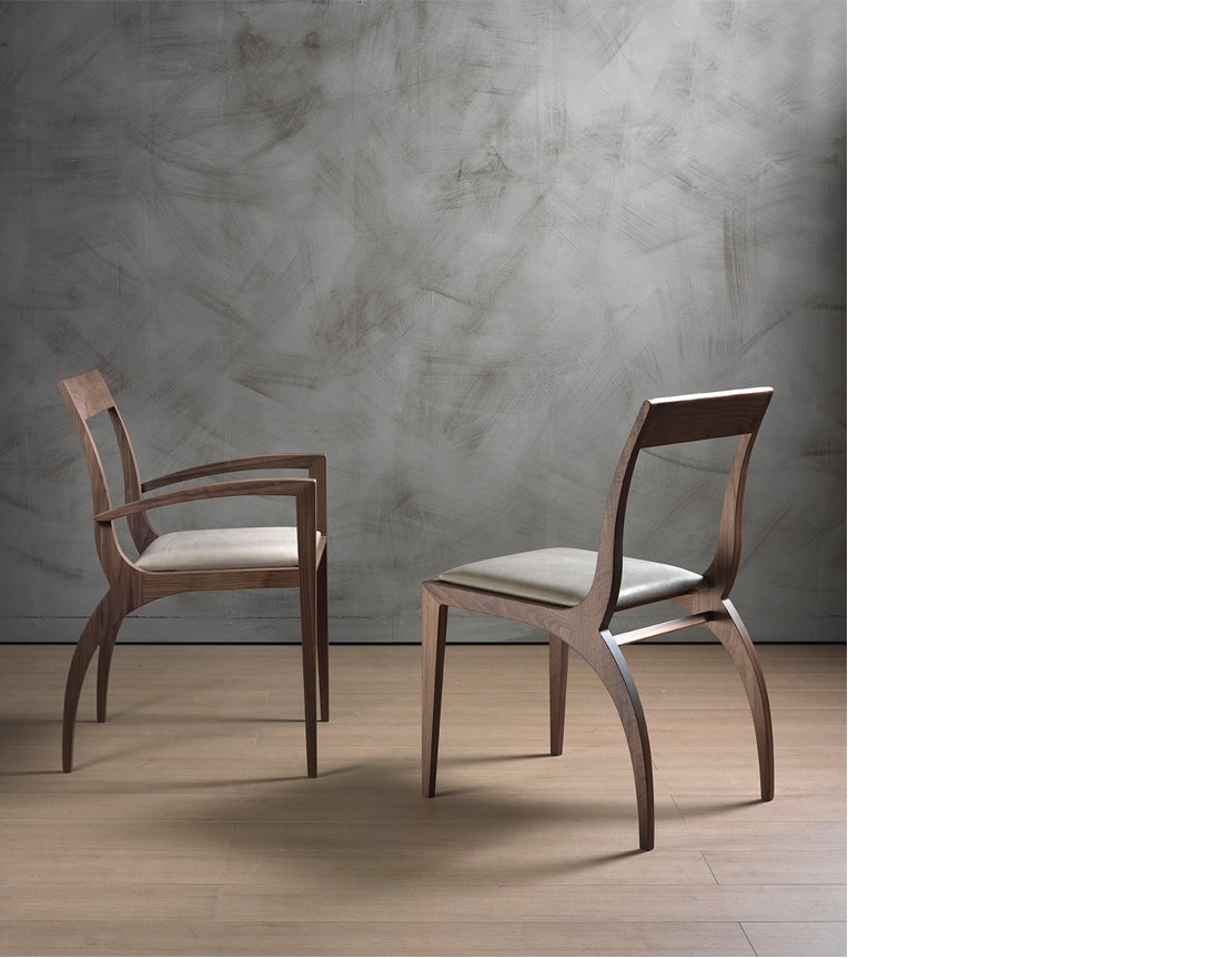 La sedia e poltroncina Thelma hanno una struttura in massello di noce canaletto. Seduta rivestita in pelle, ecopelle o tessuto della collezione. Rivestimento seduta in tessuto fisso o sfoderabile. Finiture disponibili: WG wengé, NK noce canaletto.