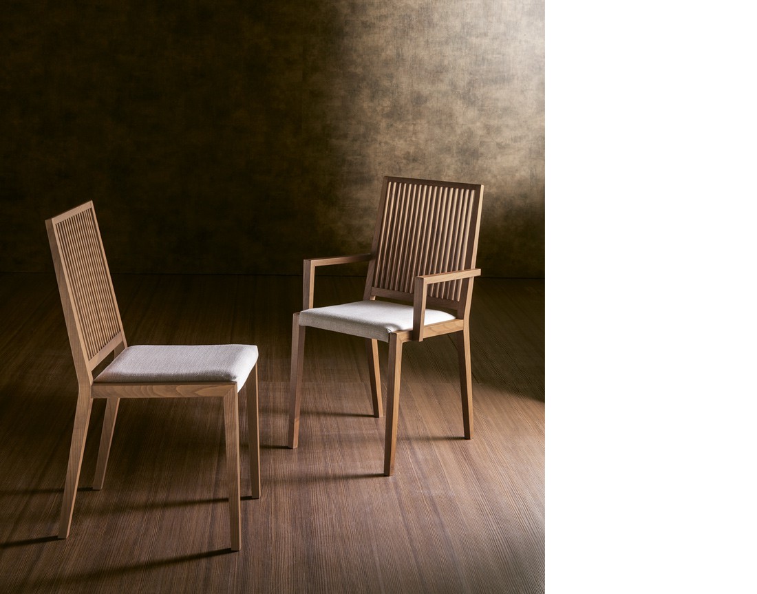 Sedia e poltroncina con struttura in massello di frassino, seduta rivestita in pelle, ecopelle o tessuto della collezione. Rivestimento seduta in tessuto fisso o sfoderabile. Finiture disponibili: WG wengé, NC noce, TB tabacco, laccato opaco poro aperto ( L21 bianco, L29 madreperla, L23 cappuccino, L25 grigio fumo, L22 nero, L24 rosso ).