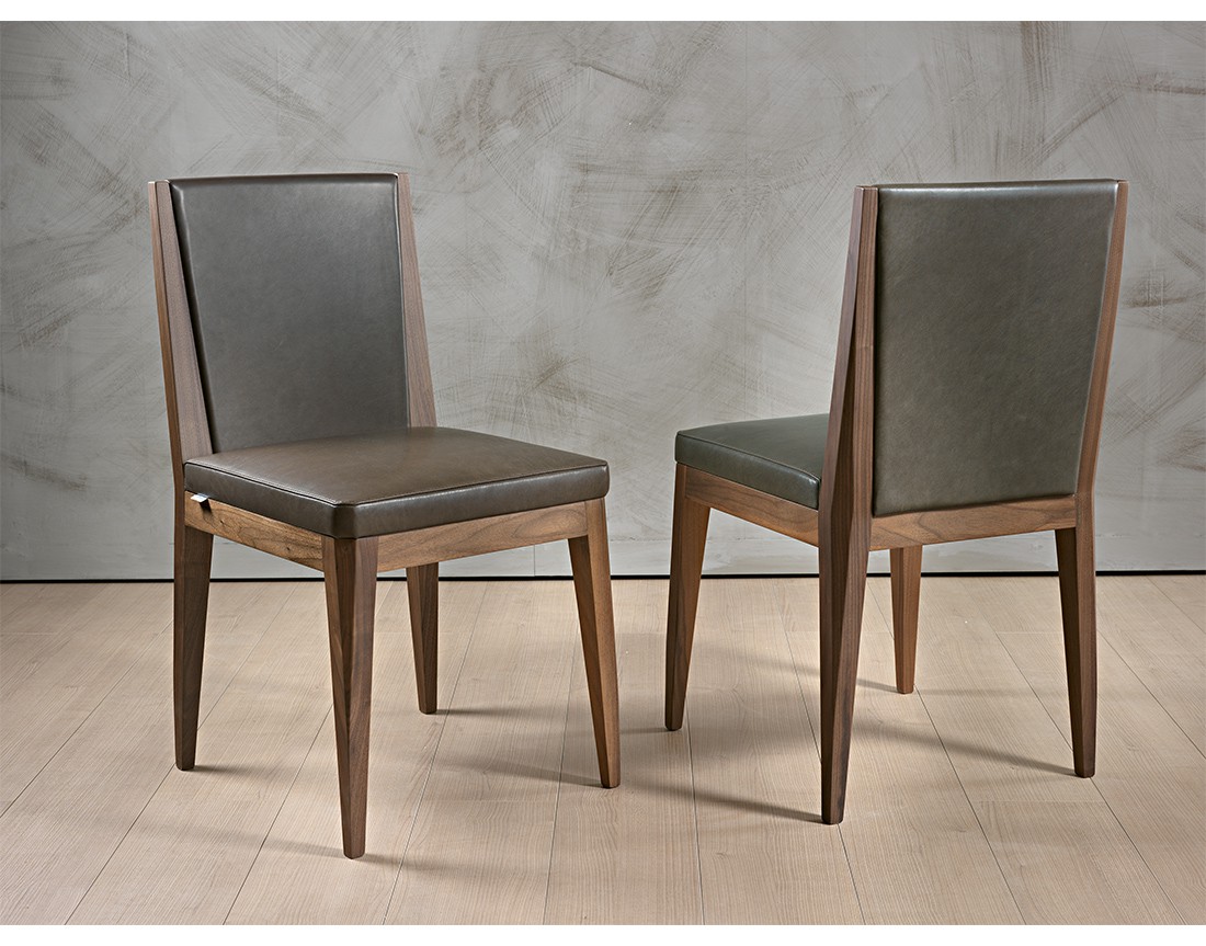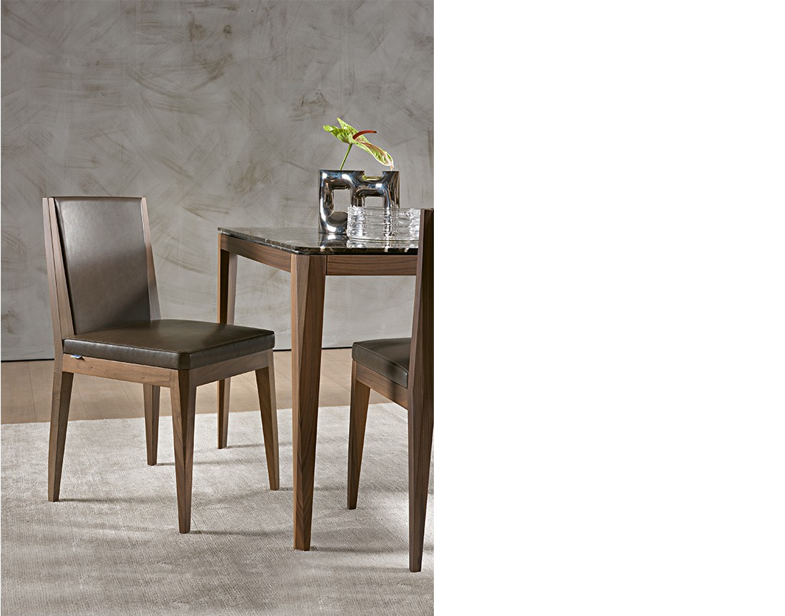 Sedia con struttura in massello di noce canaletto o frassino. Seduta e schienale rivestiti in pelle, ecopelle o tessuto della collezione. Rivestimento seduta in tessuto fisso o sfoderabile. Finiture disponibili: FN frassino naturale, WG wengé, NC noce, TB tabacco, NK noce canaletto, laccato opaco poro aperto ( L21 bianco, L29 madreperla, L23 cappuccino, L25 grigio fumo, L22 nero, L24 rosso ).
