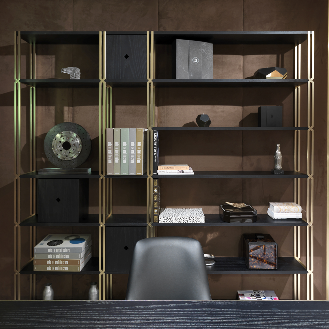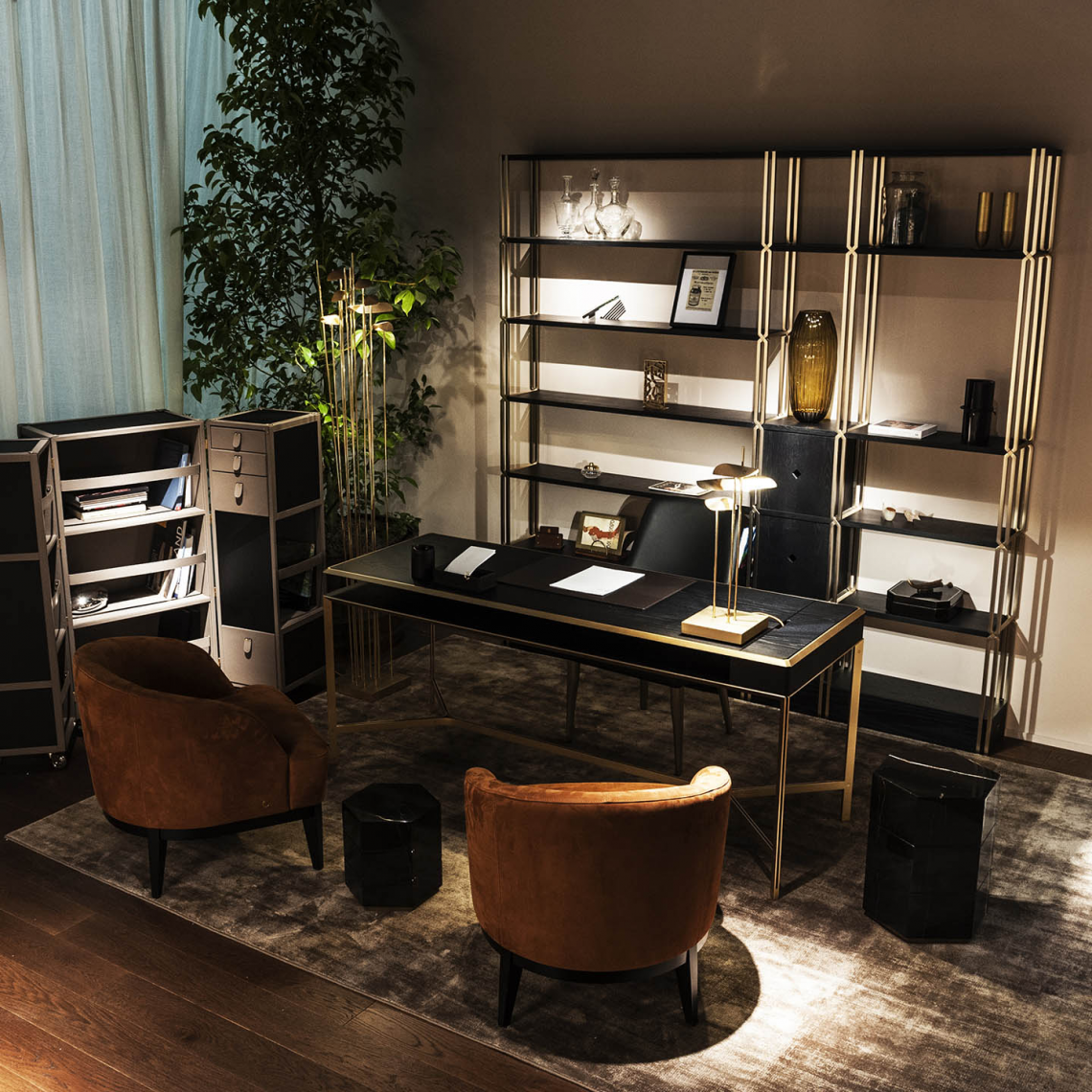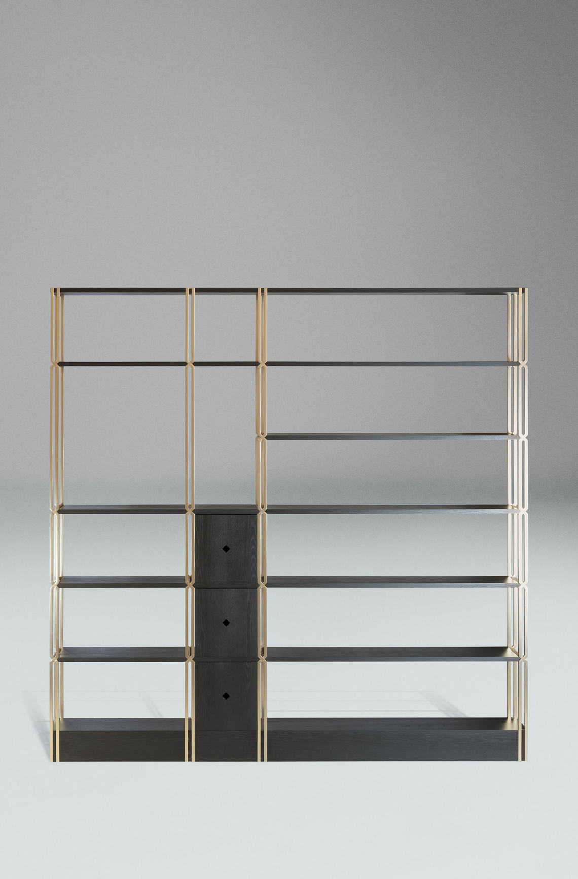 La libreria è composta da montanti intrecciati tra loro in acciaio con finitura oro opaco dipinta artigianalmente a sezione quadrata, che si incrociano a 45 gradi, formando un particolare disegno a croce. I ripiani e lo zoccolo sono rivestiti in essenza frassino black. Infine, la libreria si correda di 3 cassetti in legno, con la medesima finitura.