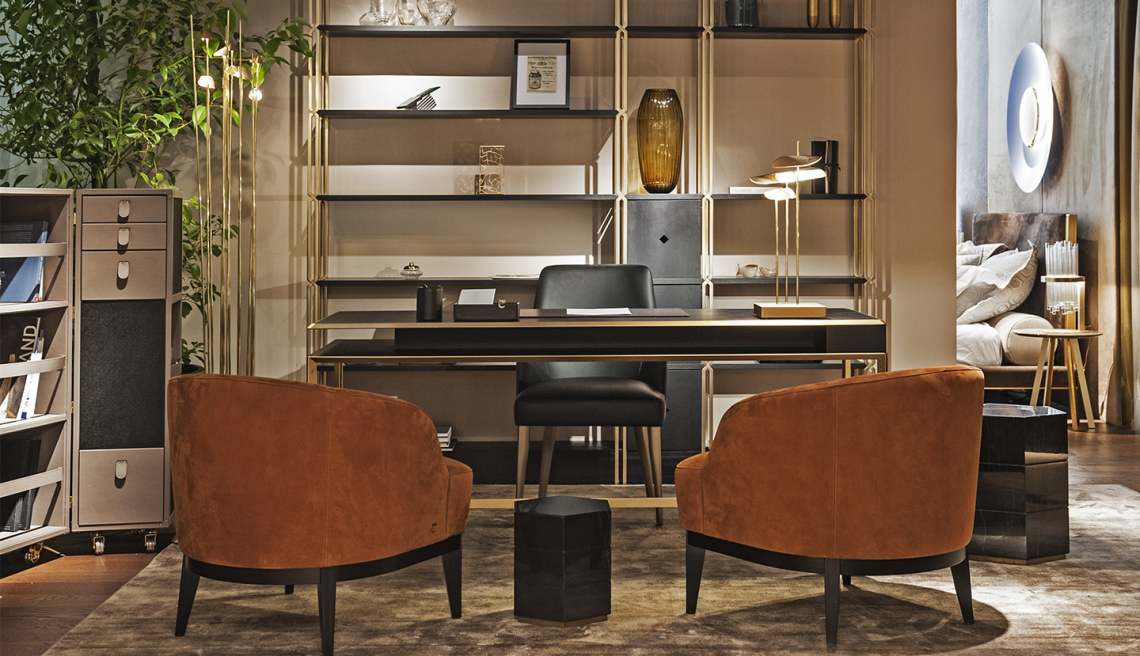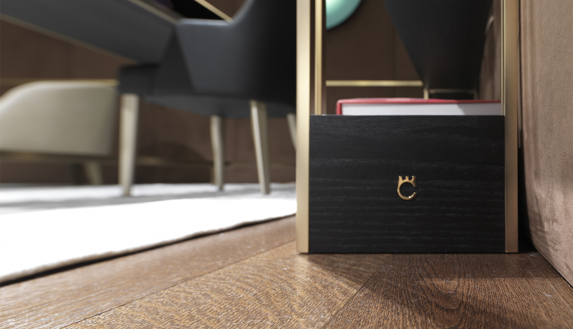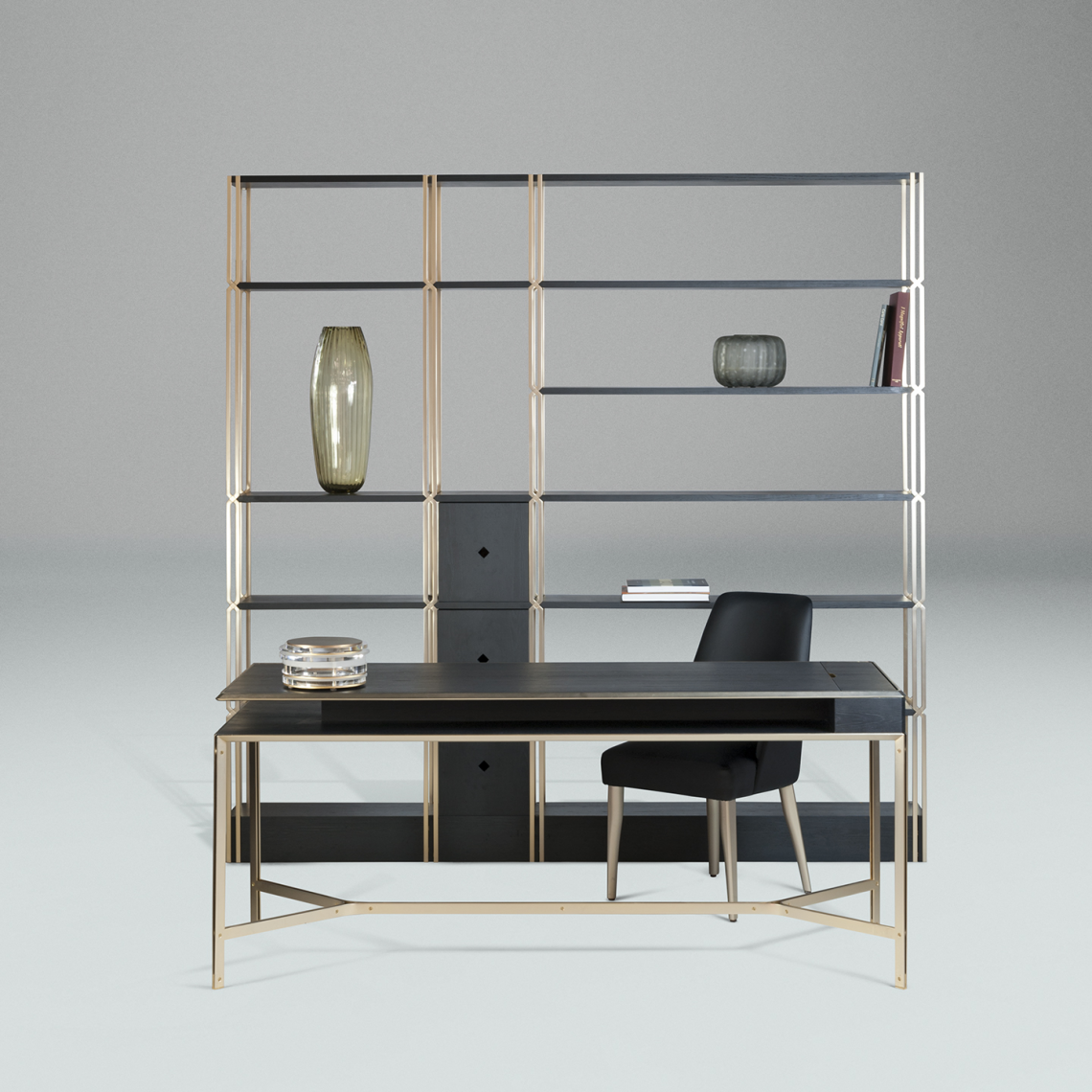 La libreria è composta da montanti intrecciati tra loro in acciaio con finitura oro opaco dipinta artigianalmente a sezione quadrata, che si incrociano a 45 gradi, formando un particolare disegno a croce. I ripiani e lo zoccolo sono rivestiti in essenza frassino black. Infine, la libreria si correda di 3 cassetti in legno, con la medesima finitura.
