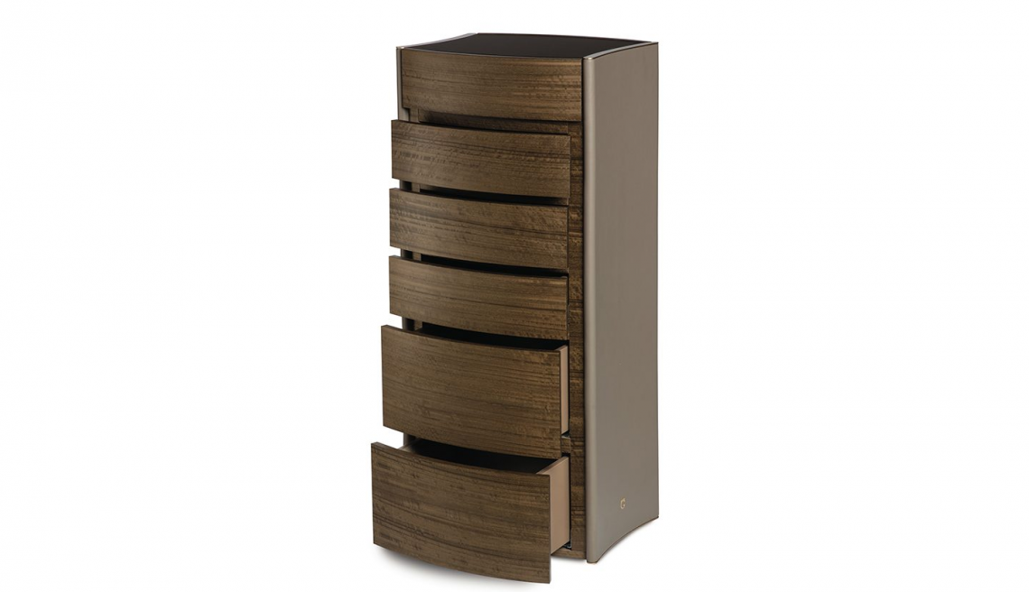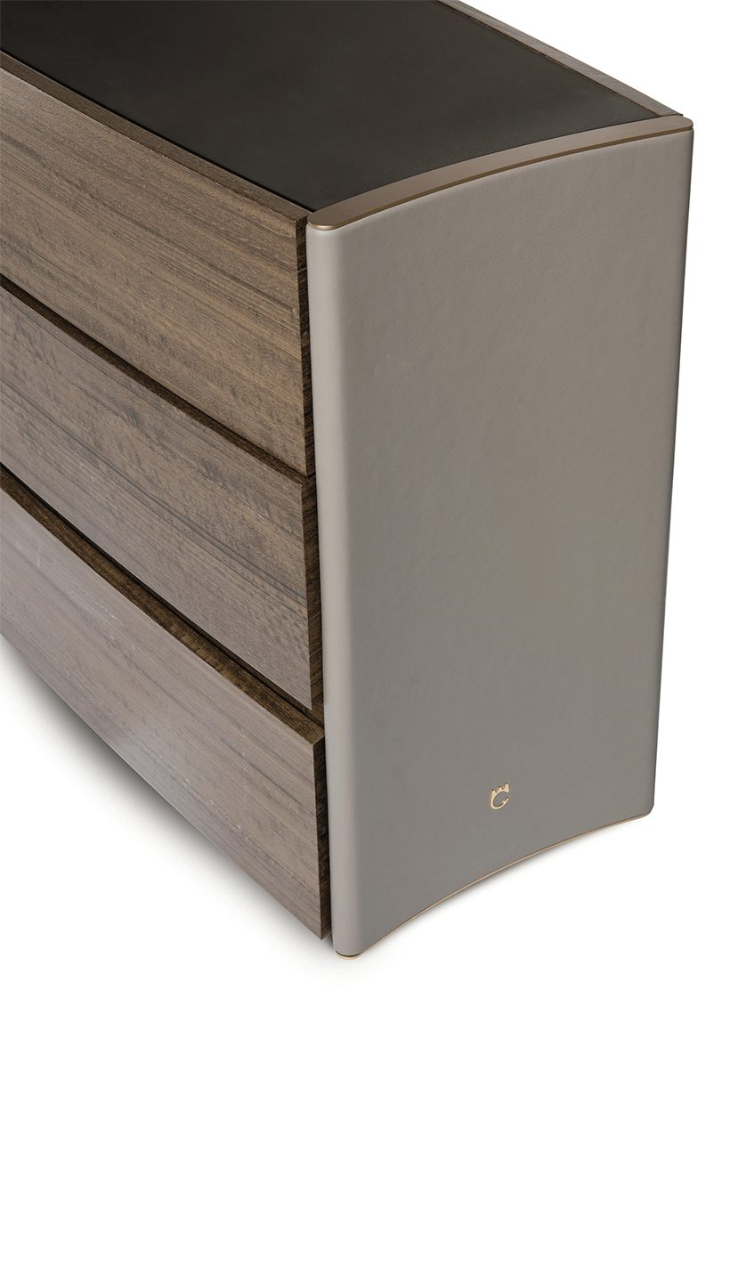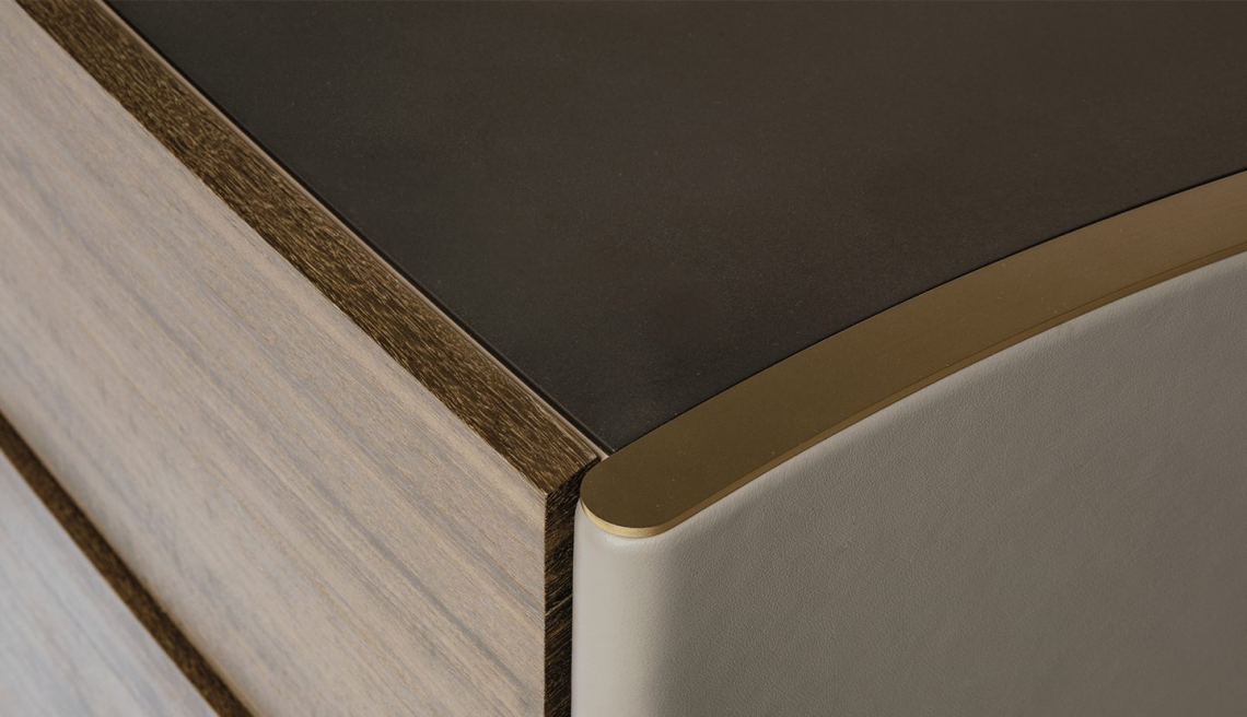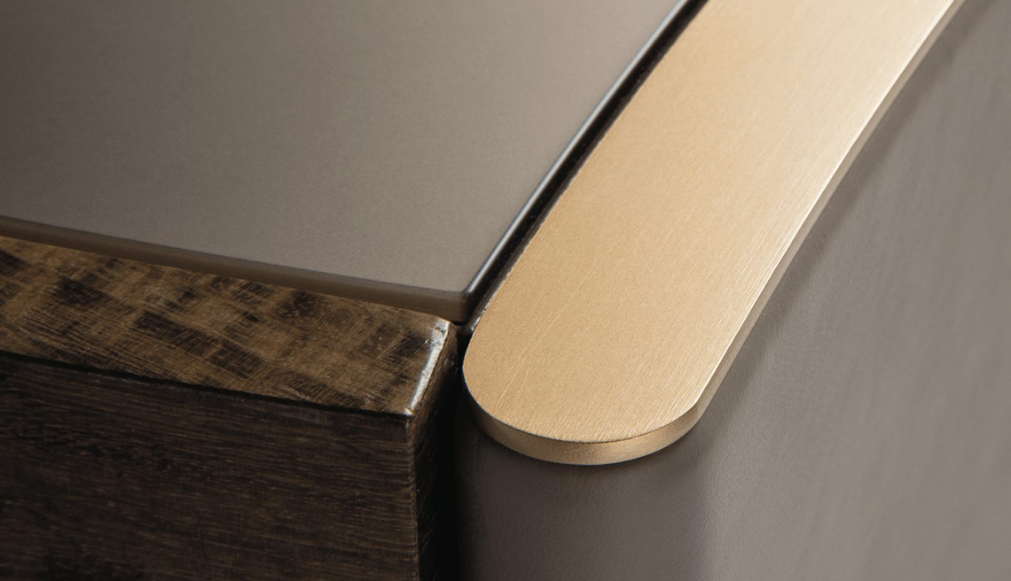Il top è in specchio bronzo satinato mentre i fianchi sono rivestiti in pregiati pellami con bordatura di chiusura (sopra e sotto) in metallo oro satinato opaco.
