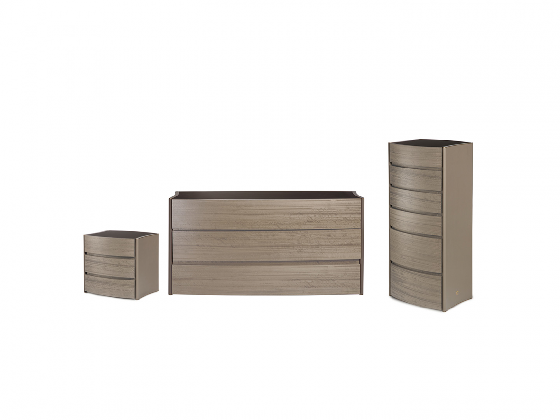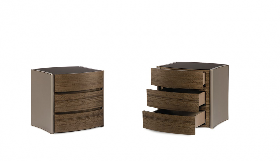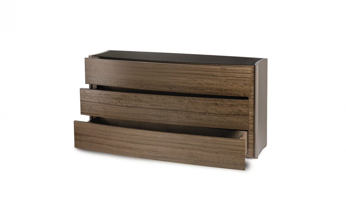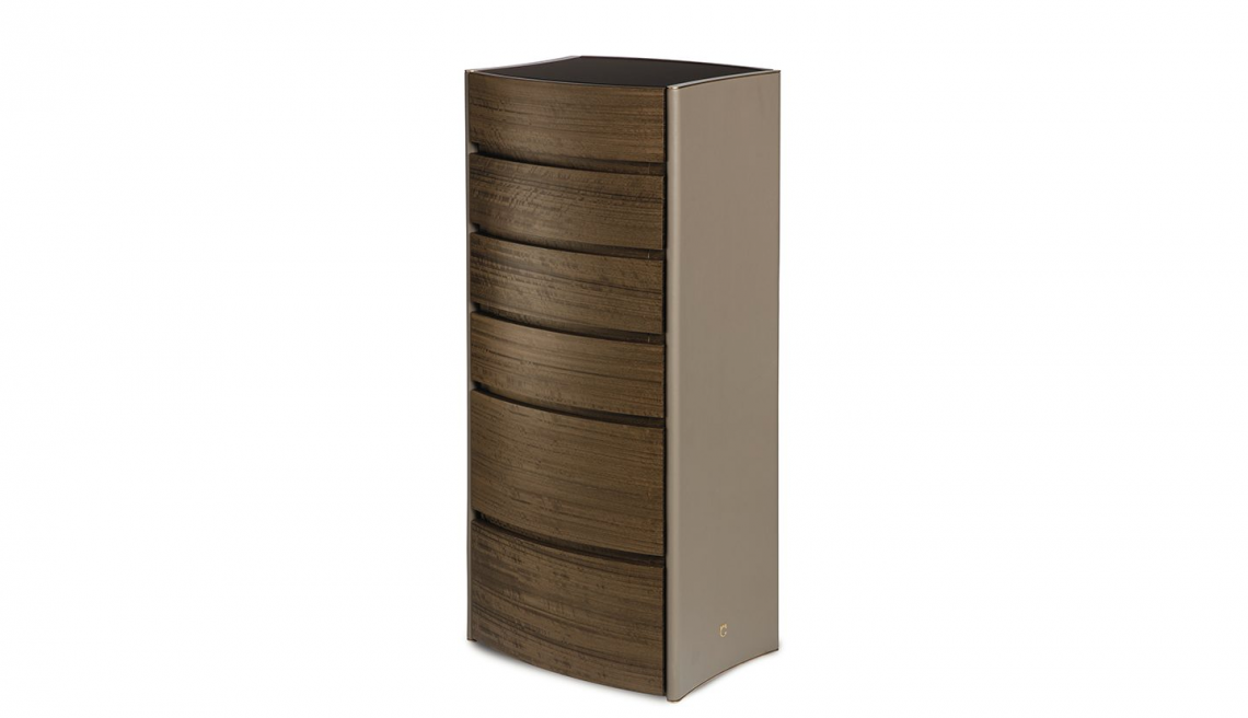 Il top è in specchio bronzo satinato mentre i fianchi sono rivestiti in pregiati pellami con bordatura di chiusura (sopra e sotto) in metallo oro satinato opaco.