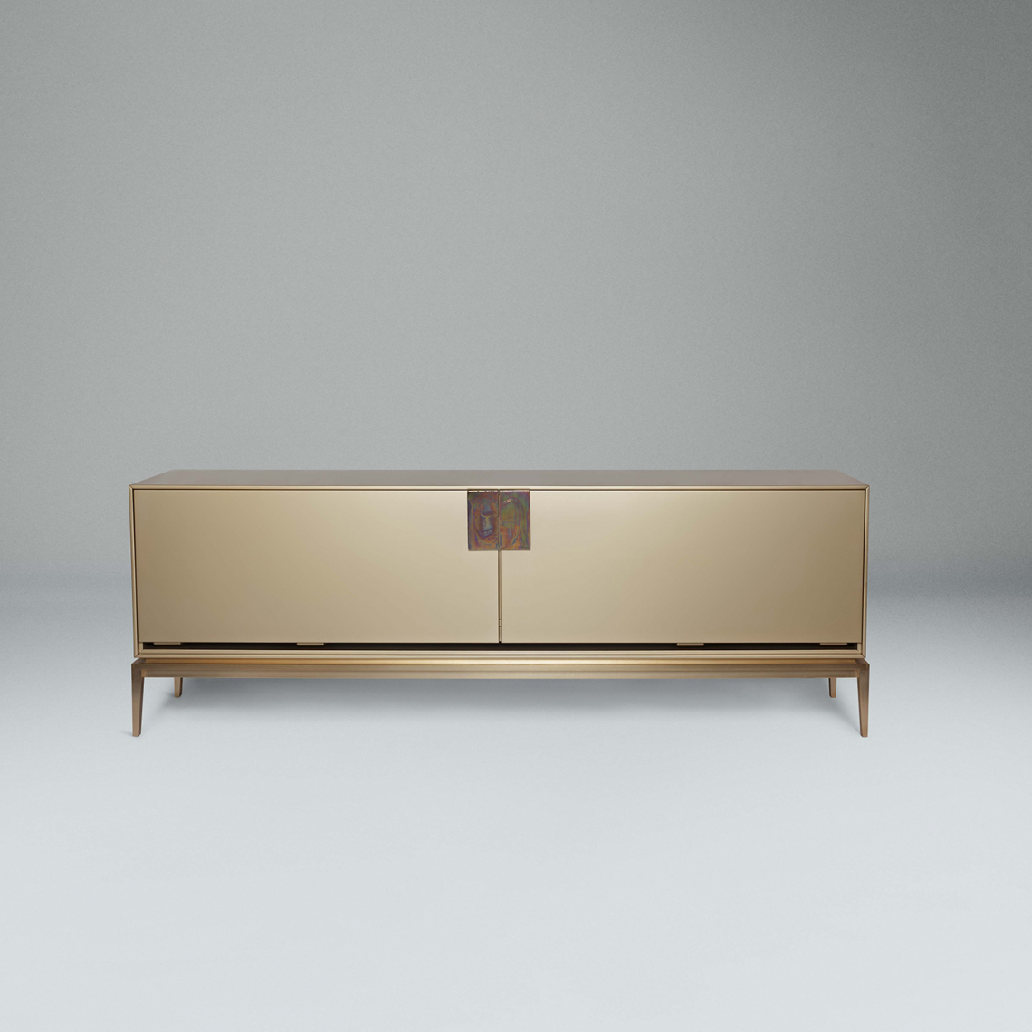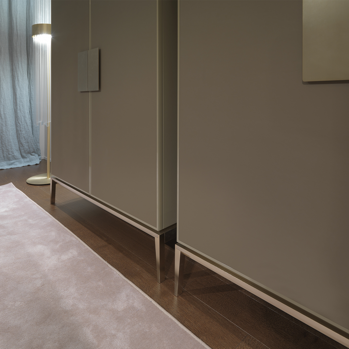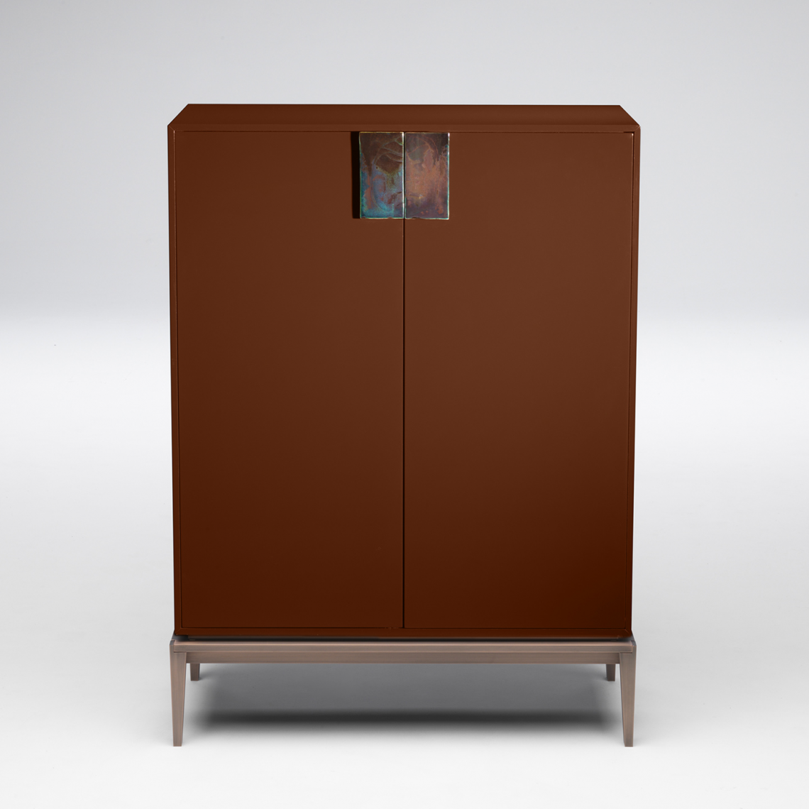 L’interno si presenta laccato opaco in tinta, con schiena rivestita in vetro specchiato satinato col. bronzo e organizzato con opportuni 4 ripiani in cristallo oppure 3 cassetti, 1 ripiano verniciato lucido 100 gloss e 1 ripiano in cristallo. Luce led interna.
