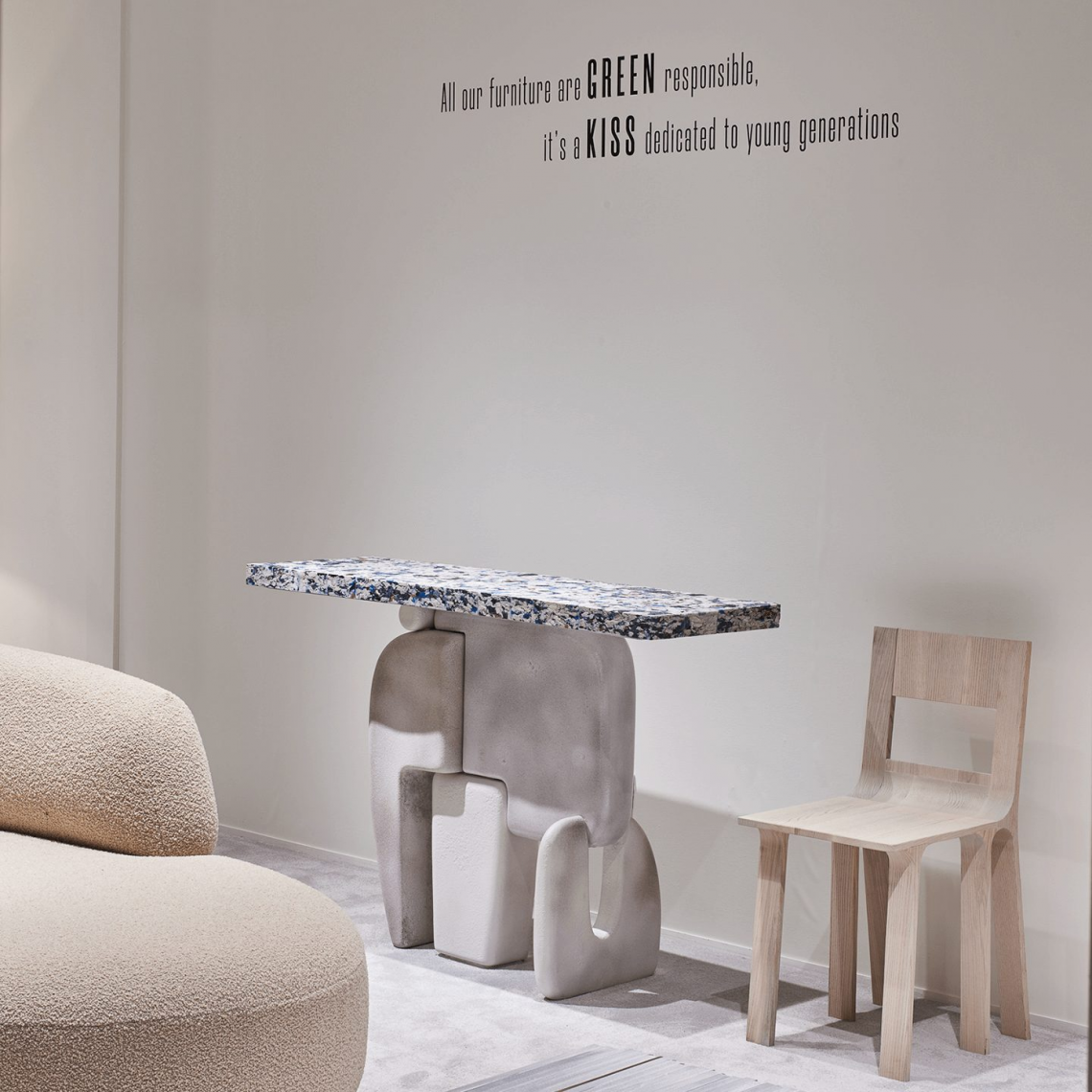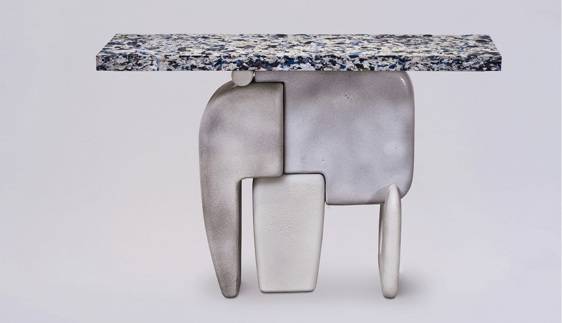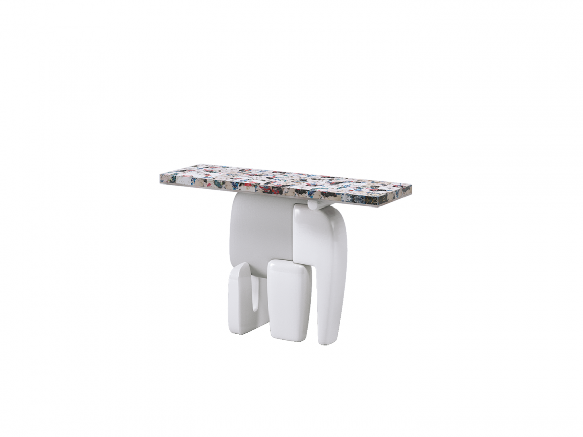 Console monolitica dalle forme scultoree ed iconiche. La base è realizzata in ceramica artigianale di Faenza di colore bianco, con alternanza di finitura smaltata e opaca materica negli elementi che la compongono. Il top, di spessore 5 cm, è realizzato con un’anima in mattoni di tessuto riciclato pressato e finitura esterna in resina biologica trasparente.