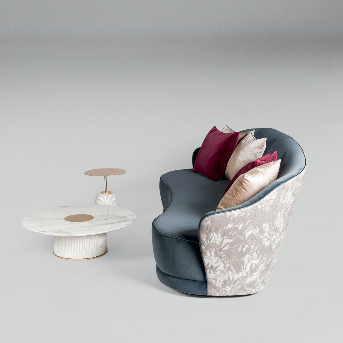 Tavolini scultorei che abbinano, in forme diverse marmo, metallo verniciato oro opaco e la ceramica artigianale finemente lavorata a Vietri.