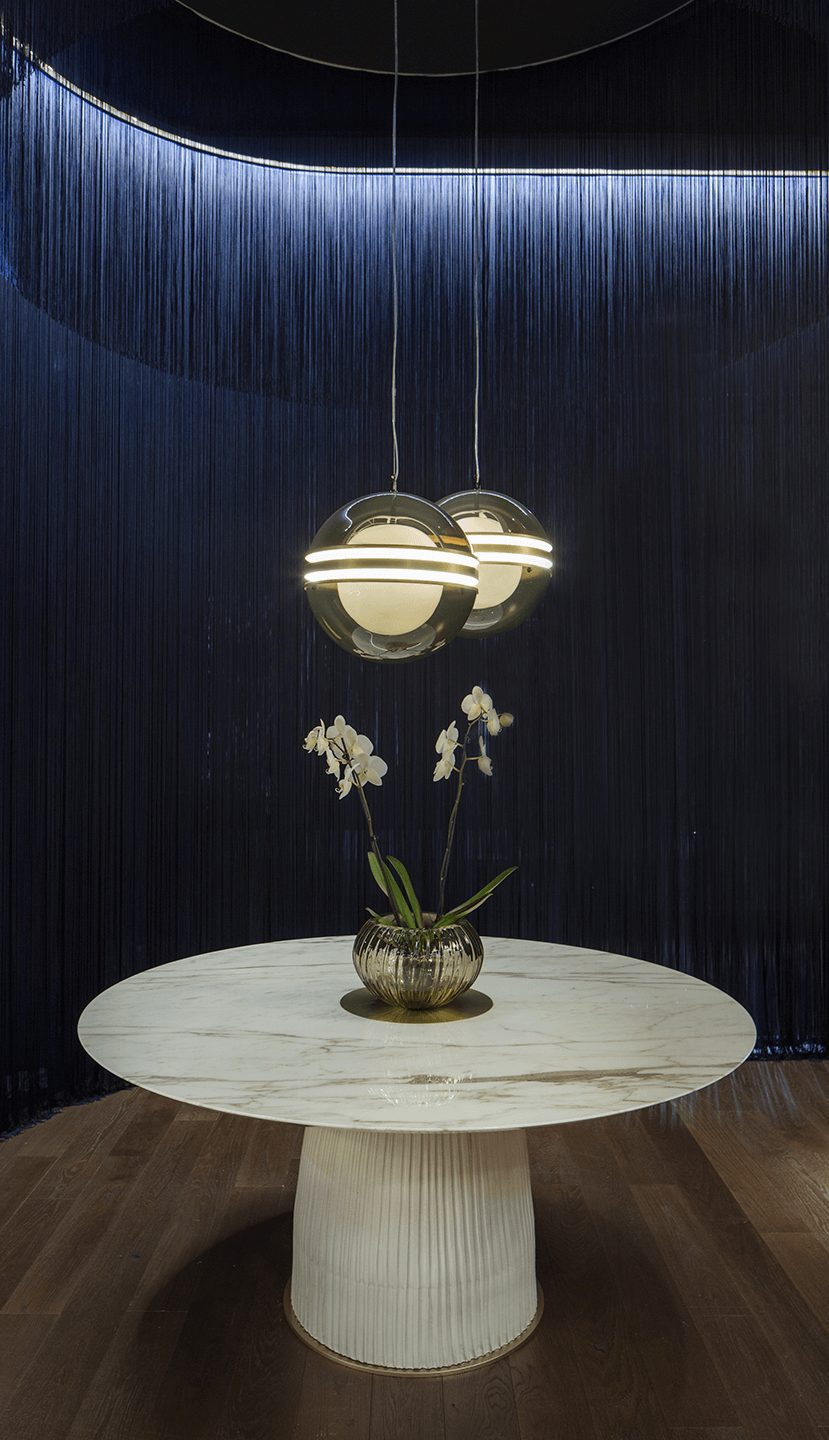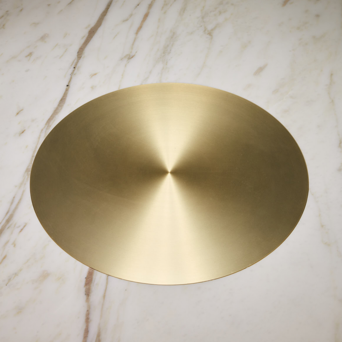 Base a forma di campana realizzata in ceramica artigianale di Vietri a coste, finitura smaltata bianca, che poggia su una piastra circolare in metallo con finitura oro opaco. Piano in prezioso marmo Calacatta o White Silk opaco con bordi a spizza, disco centrale e dettagli realizzati in ottone satinato opaco.