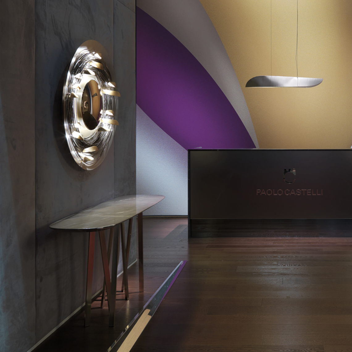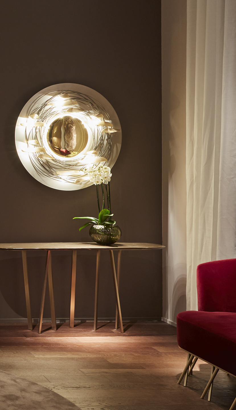 è realizzato con un piano ovale e angoli ad ala di gabbiano in pregiato marmo. La base si compone di 7 gambe in metallo con finitura oro opaco, disposte con diverse inclinazioni e saldate a un disco di fissaggio in metallo che viene fissato al piano tramite viti metalliche. Spessore piano 2cm.