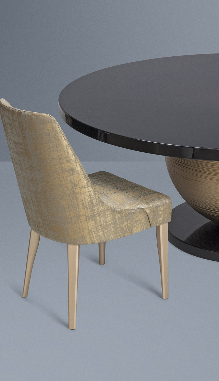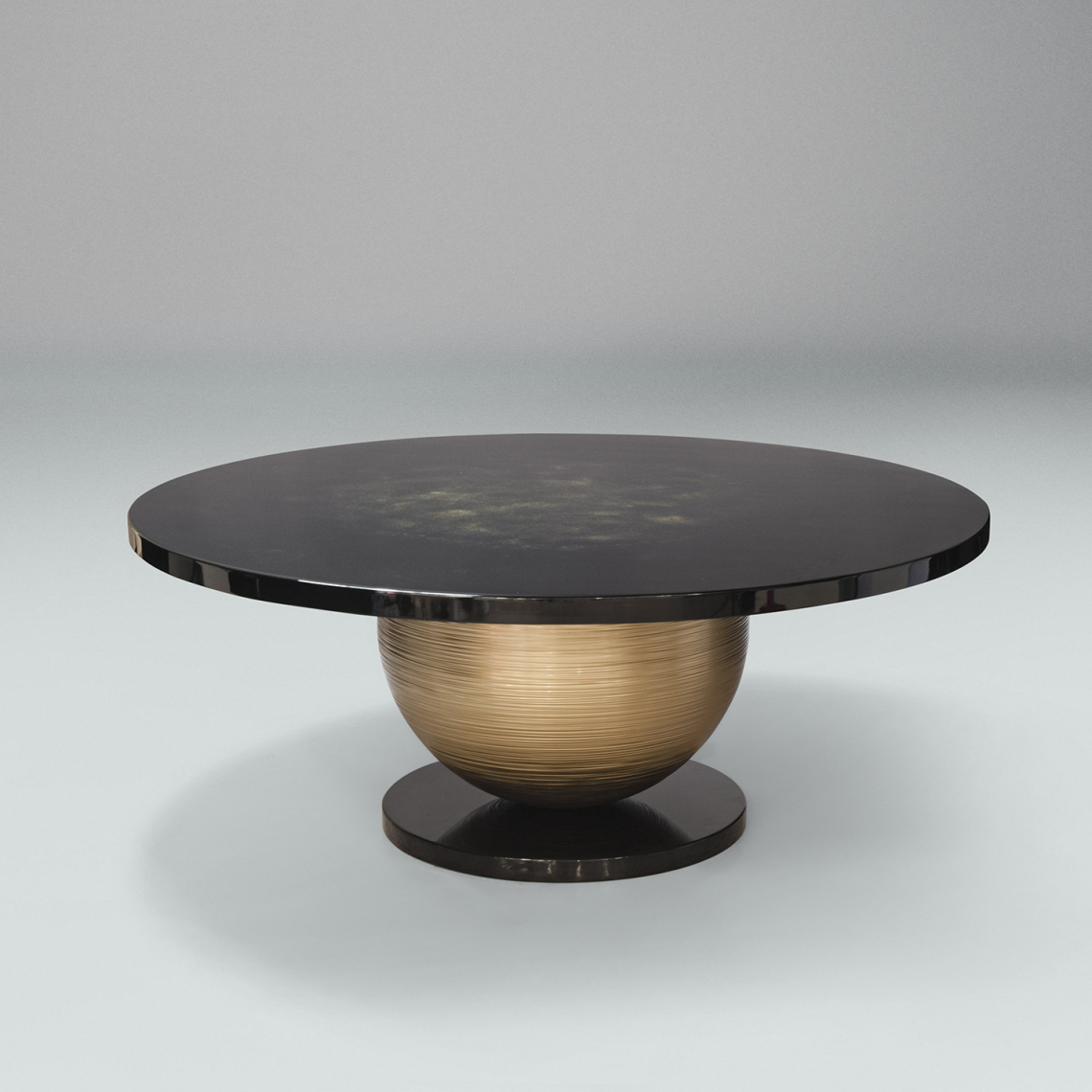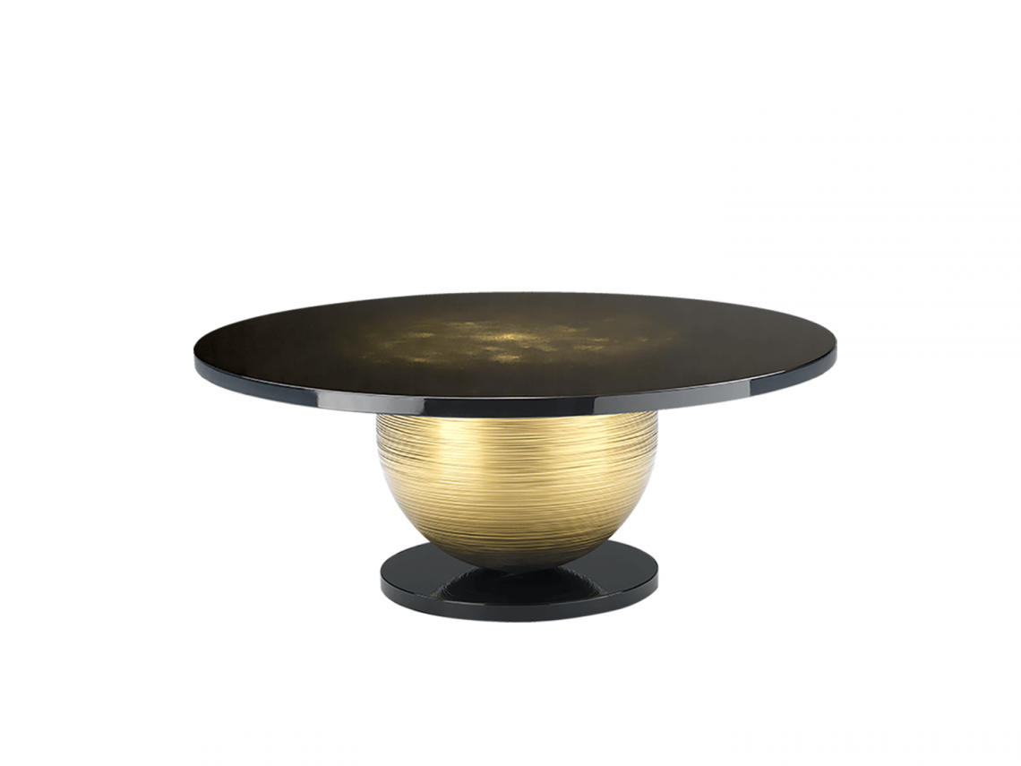 con una preziosa laccatura lucida nera 100 gloss che incorpora polvere d’oro gettata a mano a più strati, creando un effetto tridimensionale che ne esalta la bellezza. La base è formata da una elegante sfera in alluminio tornito in lastra con motivo rigato tridimensionale, verniciata color oro opaco e che poggia su una base tonda sempre in mdf laccata nero lucido 100 gloss.