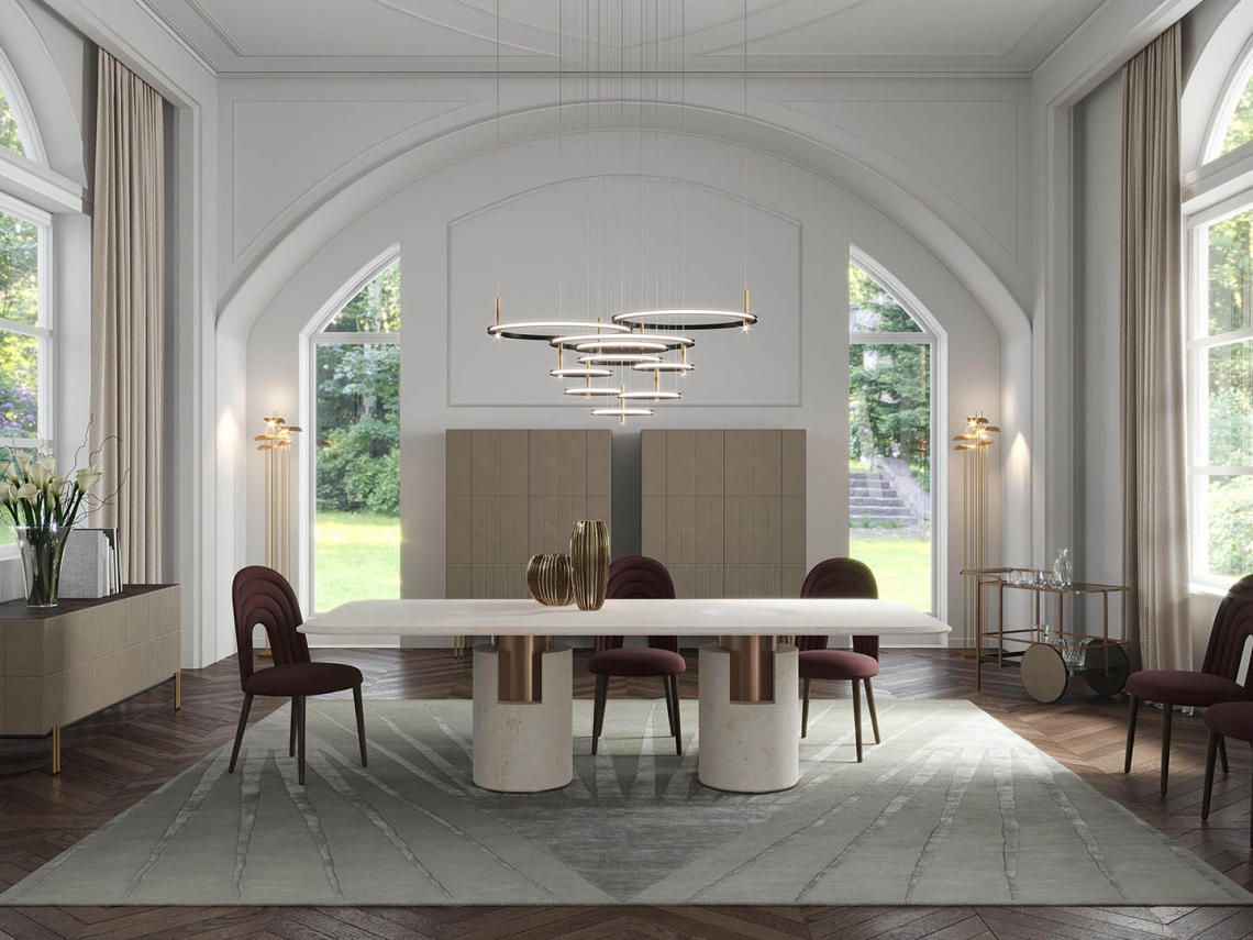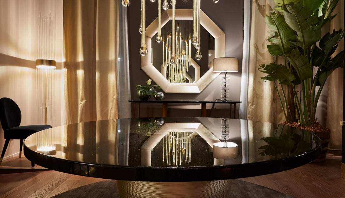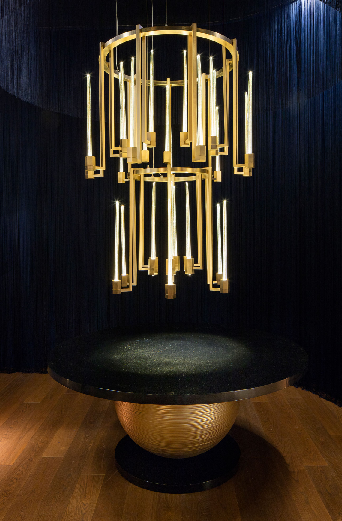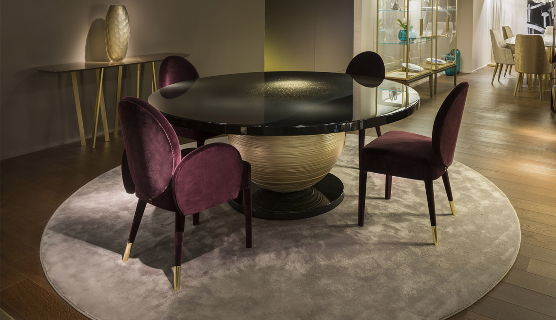 con una preziosa laccatura lucida nera 100 gloss che incorpora polvere d’oro gettata a mano a più strati, creando un effetto tridimensionale che ne esalta la bellezza. La base è formata da una elegante sfera in alluminio tornito in lastra con motivo rigato tridimensionale, verniciata color oro opaco e che poggia su una base tonda sempre in mdf laccata nero lucido 100 gloss.