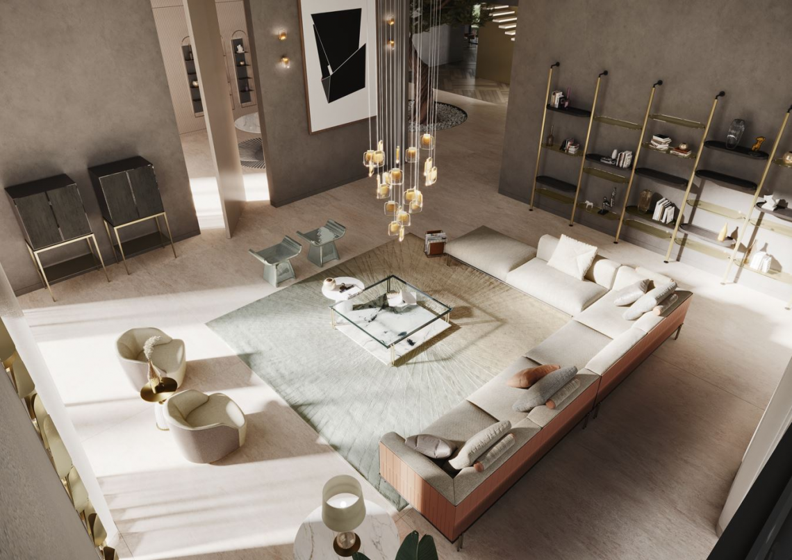 La base in metallo finitura nero opaco, con doppi piedini in metallo finitura bronzo opaco, evidenzia la leggerezza complessiva del progetto, sostenendo il ripiano superiore in vetro colore Avana e quello inferiore in pietra Pece. In alternativa, il tavolino può essere configurato con il vetro trasparente extra-chiaro ed il ripiano inferiore in marmo Lunar Breccia.