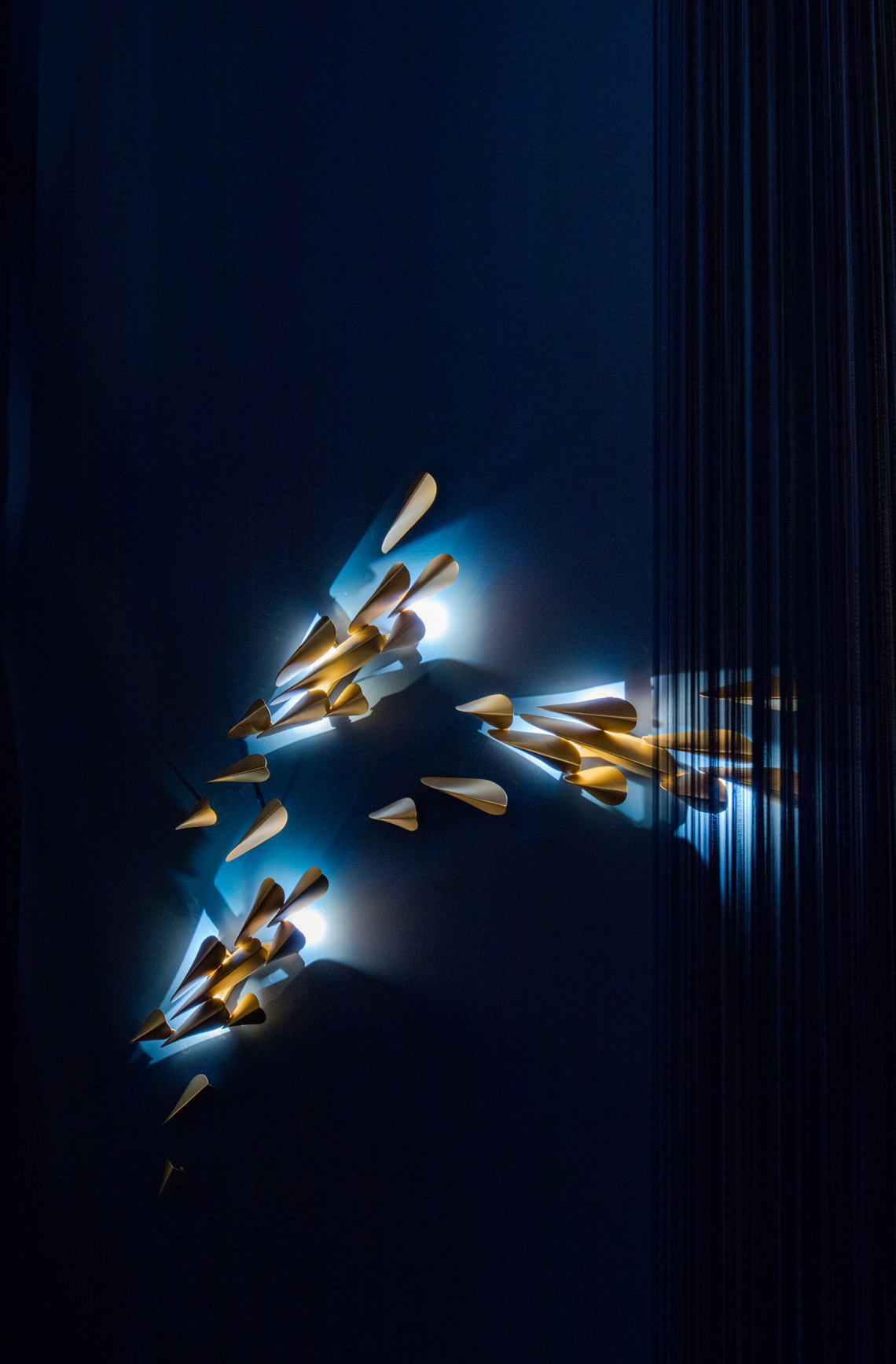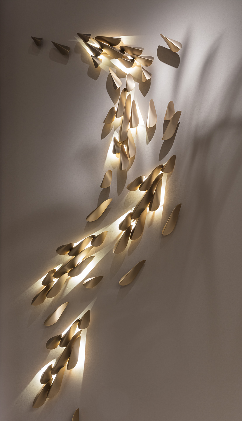 Anodine Wall è una graziosa lampada a parete che trasforma la luce in un dipinto. La composizione consta di 11 elementi, ognuno dei quali è a forma di foglia in metallo, realizzato asimmetricamente a mano da esperti artigiani con finitura oro satinato. Nel modulo fisso a 8 elementi, 3 sono dotati di Led da 2W ognuno. La composizione è completata da 3 elementi singoli, da disporre a piacere per creare infinite combinazioni. La preziosità della lavorazione artigianale rende ogni pezzo della collezione unico nel suo genere.