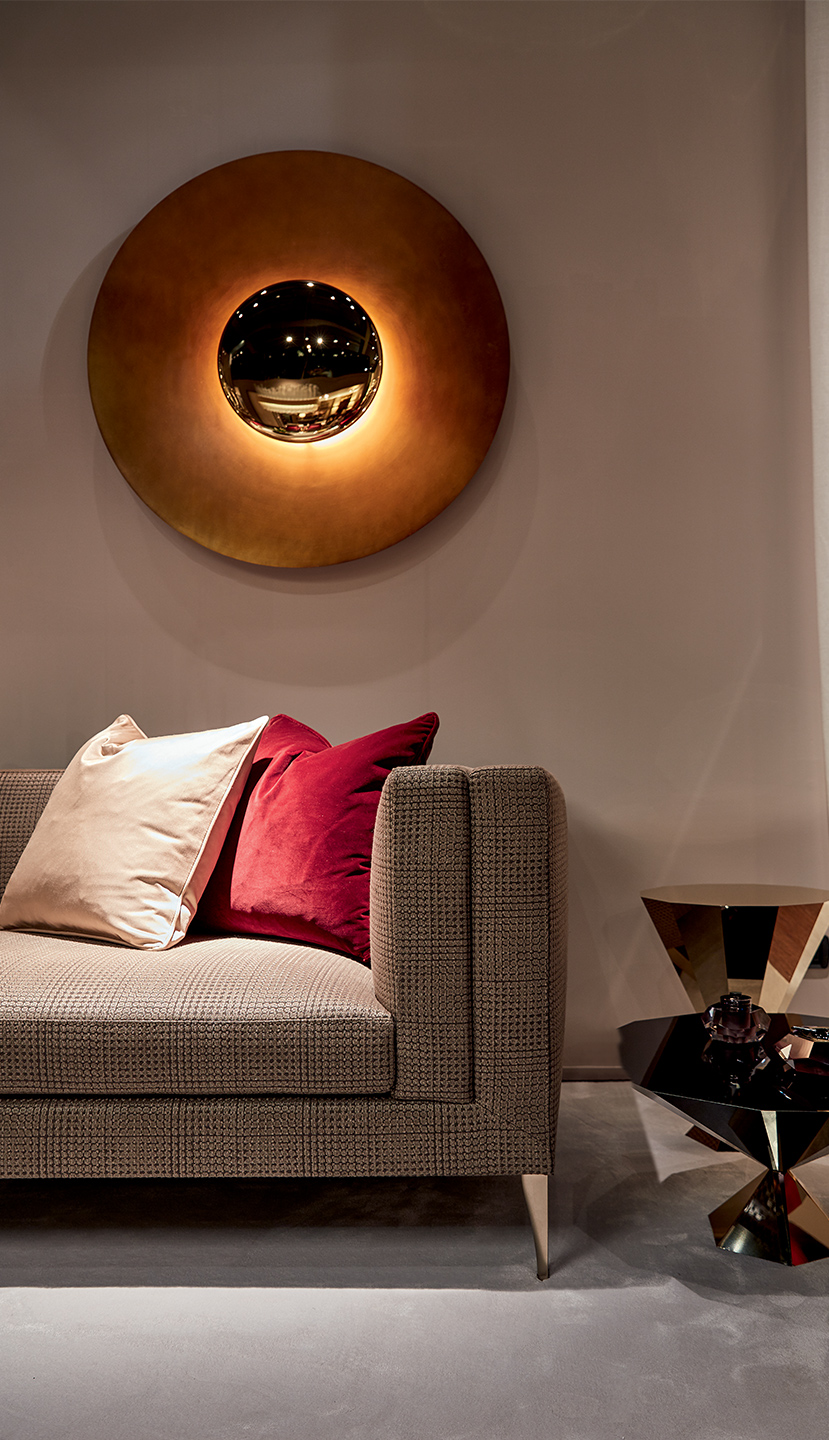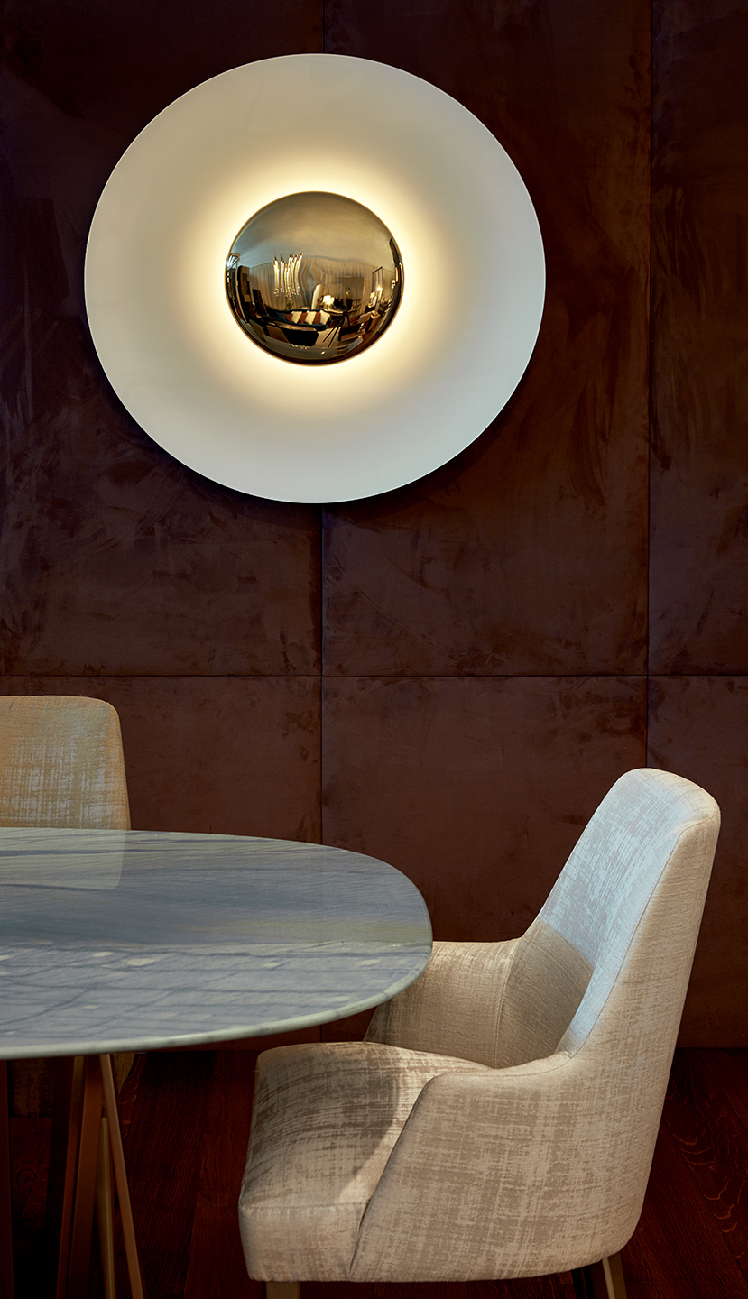 Circle Lamp è realizzata attraverso un grande disco leggermente concavo in metallo martellato a mano e smaltato a specchio in diversi colori sul quale poggia al centro, come una goccia, una mezza sfera in metallo specchiato finitura oro lucido.