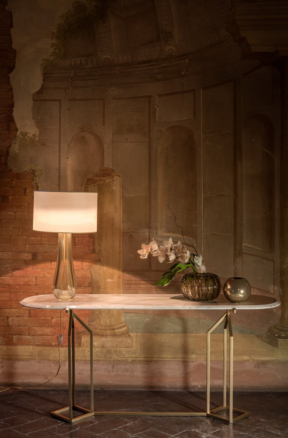 La base è a forma di goccia, realizzata in cristallo con all’interno povere d’oro 24 KT in sospensione, e paralume in tessuto realizzato artigianalmente.