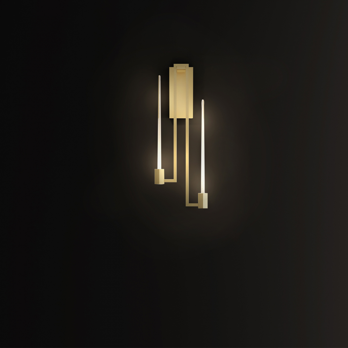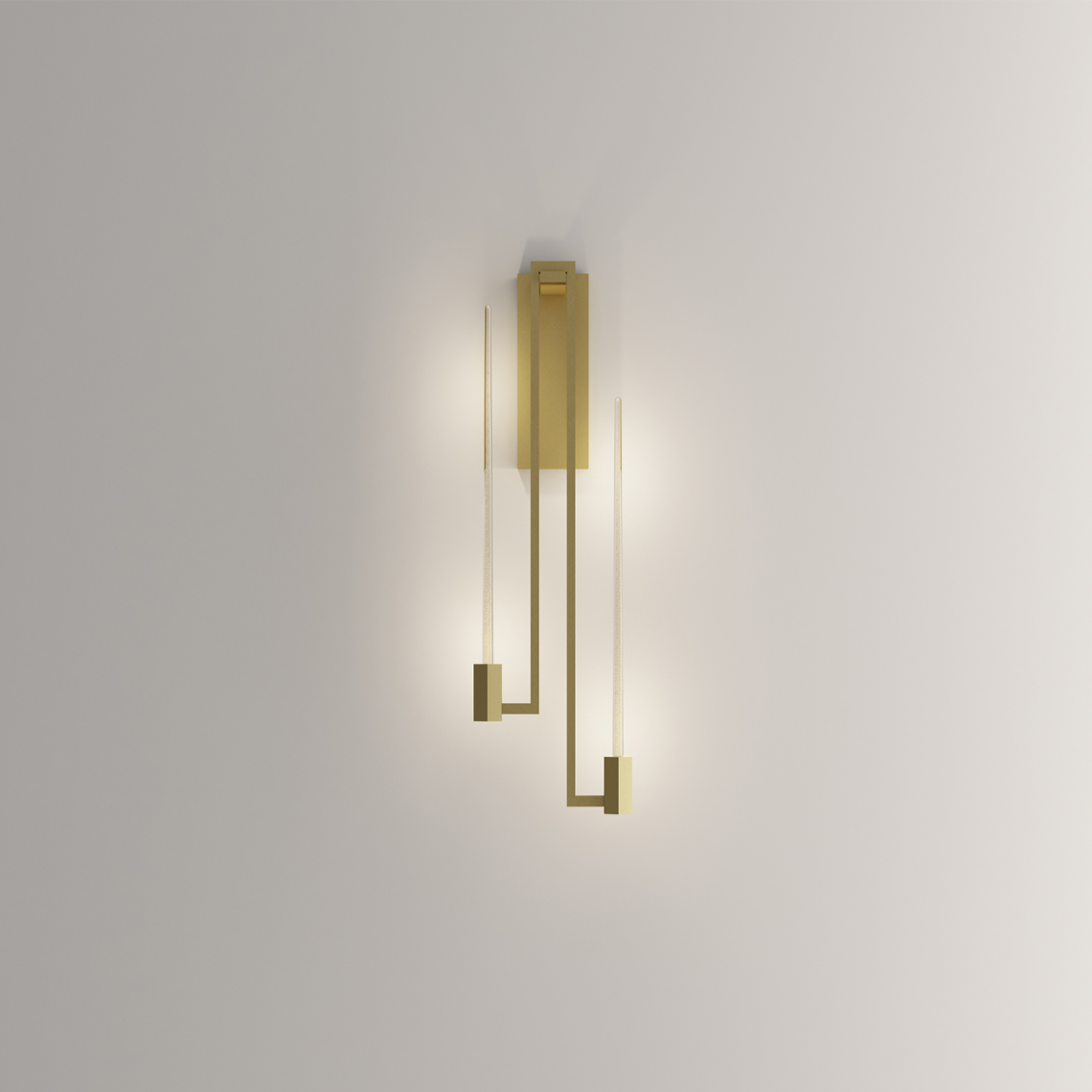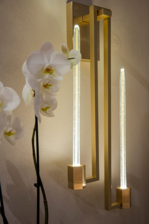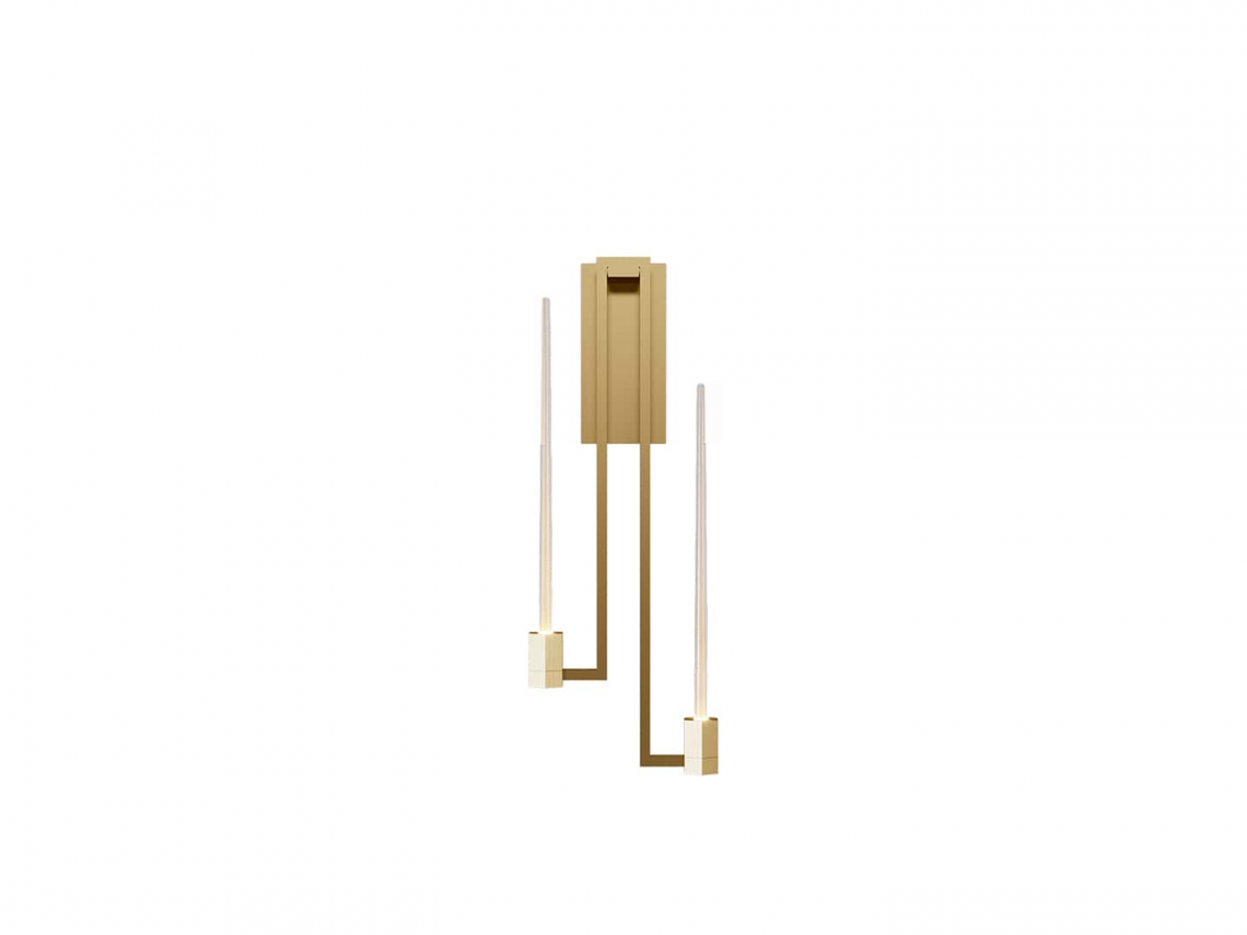 Della linea fa parte anche questa versione applique, realizzata con due bracci in ottone fiitura oro opaco che sorreggono elementi in vetro di Murano con foglia d’oro 24 KT all’interno, in dispersione.