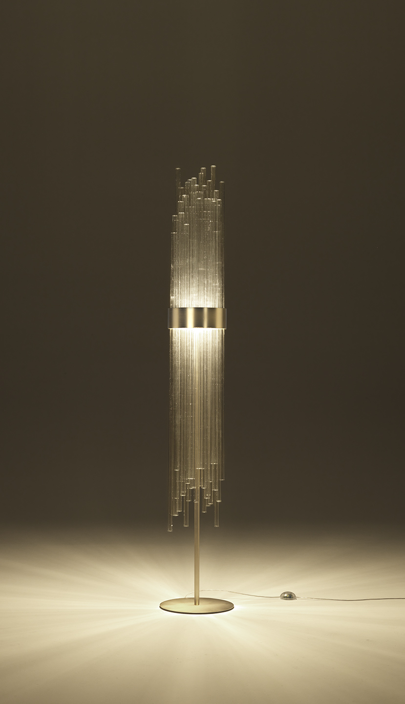 è realizzato con una base e struttura in metallo in oro opaco e tubi cilindrici aperti realizzati in vetro borosilicato veneziano.