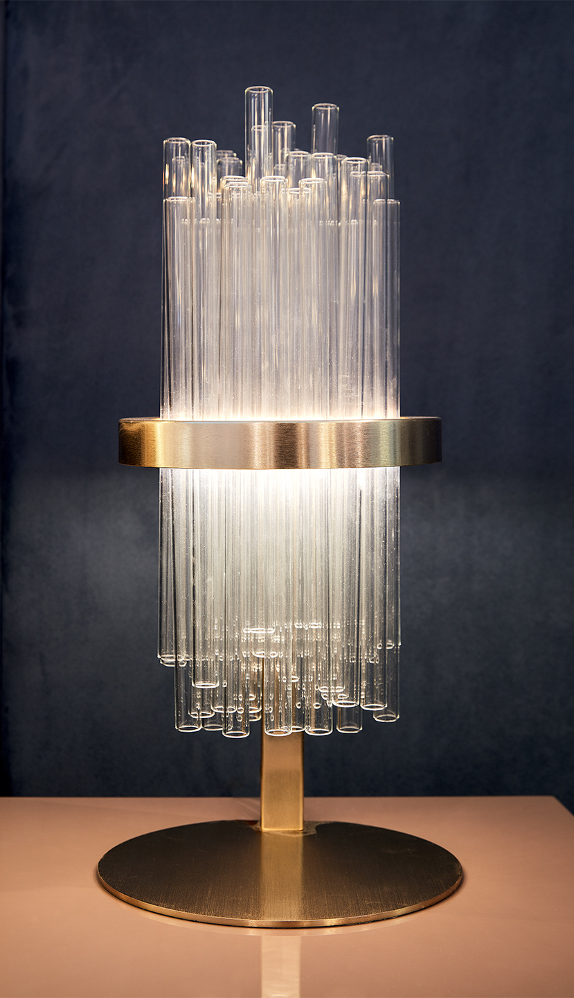 My lamp table è una graziosa ed elegante lampada da tavolo, ideale per studi, salotti e zona notte, composta da una struttura metallica trattata in finitura oro opaco che regge un piccolo bouquet di tubi realizzati in vetro borosilicato veneziano.