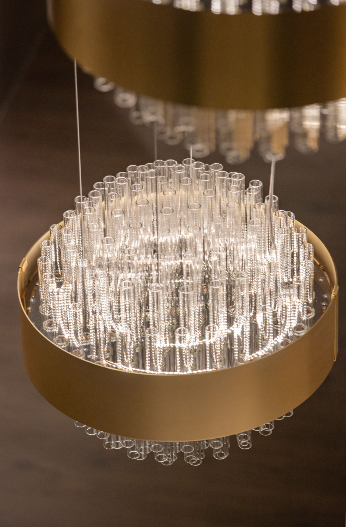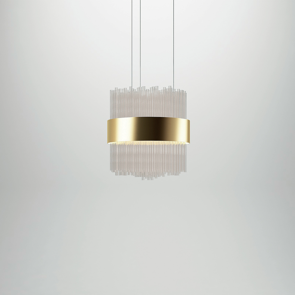 è composto da un importante bouquet di tubi realizzati in vetro borosilicato veneziano posti ad altezze sfasate e raccolti in una fascia metallica curvata, trattata con particolare finitura a più strati oro opaco. Il telaio portante interno è realizzato in metallo nichelato. Contropiastra opalescente per diffondere la luce.
