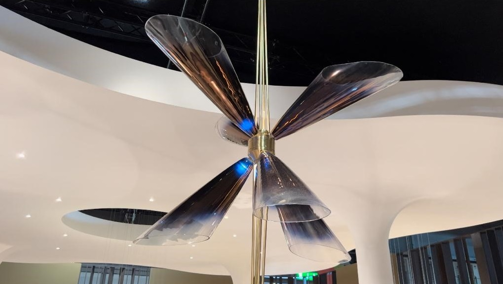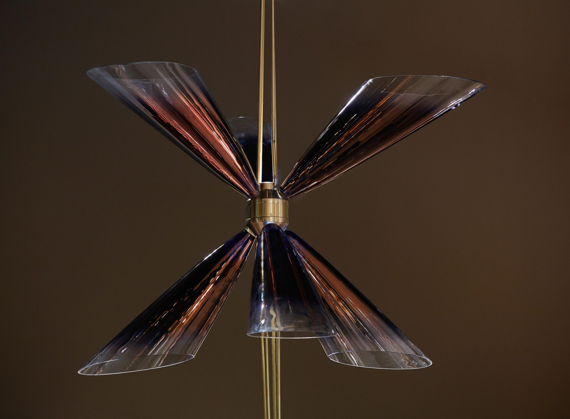 Stellantis è una scultura luminosa sospesa, immaginata per diventare il centro focale dell’ambiente. Suggestiva e poetica, è composta da sei coni in vetro fatti a mano artigianalmente, con una particolare sfumatura metallizzata in bronzo, realizzati ad uno ad uno dai maestri vetrai di Murano. Sono fissati su un’asta verticale in ottone opaco. Illuminati da sorgente led, gli elementi in vetro diffondono nell’ambiente tanti piccoli riflessi cangianti con un effetto espressivo e scenografico. Anche dimmerabile.