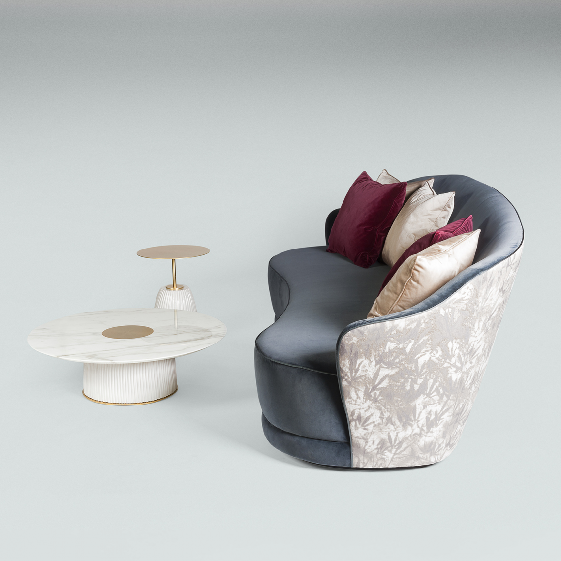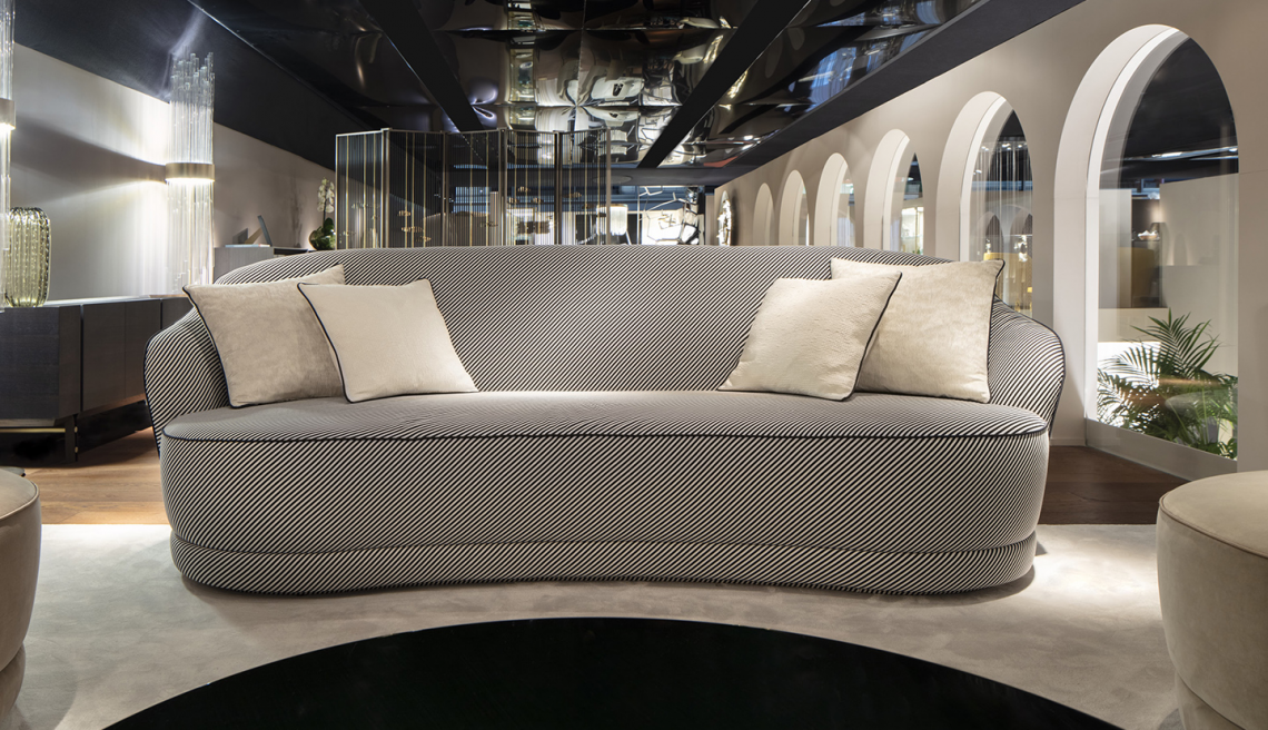 è provvisto di zoccolo in legno rivestito con il medesimo rivestimento. Il rivestimento, non sfoderabile, può essere personalizzato con morbidi velluti e cuscini decorativi. Possibilità di rivestire lo schienale a contrasto. Il rivestimento è realizzato con piping in tinta che impreziosisce ed esalta la linea del divano.
