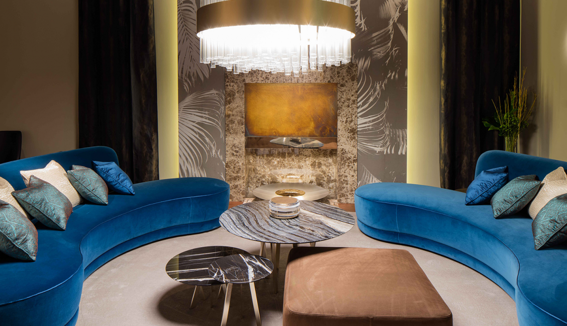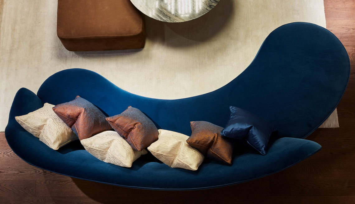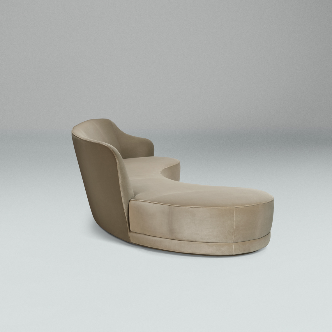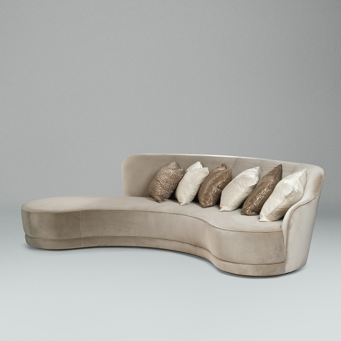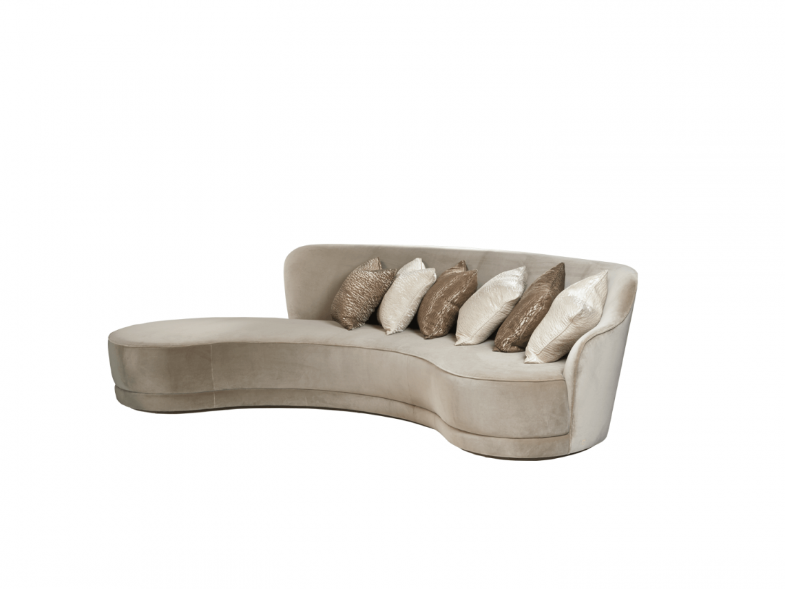 è provvisto di zoccolo in legno rivestito con il medesimo rivestimento. Il rivestimento, non sfoderabile, può essere personalizzato con morbidi velluti e cuscini decorativi. Possibilità di rivestire lo schienale a contrasto, anche con tessuti decorativi. Il rivestimento è realizzato con piping in tinta che impreziosisce ed esalta la linea del divano.