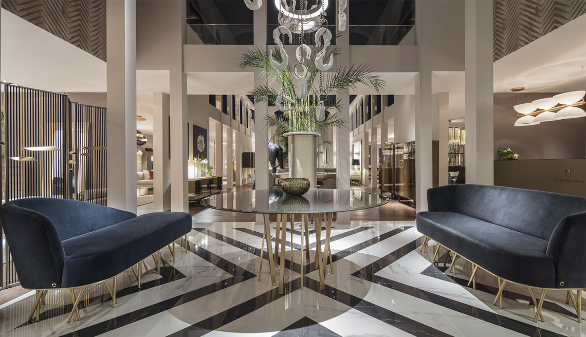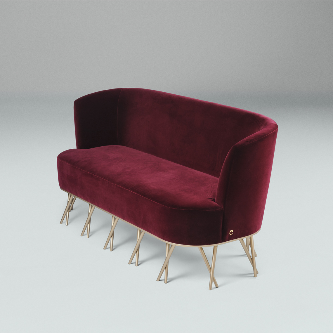 Il divano poggia su di una struttura in metallo con gambe disposte ad incrocio, arricchite con preziosa finitura oro opaco.