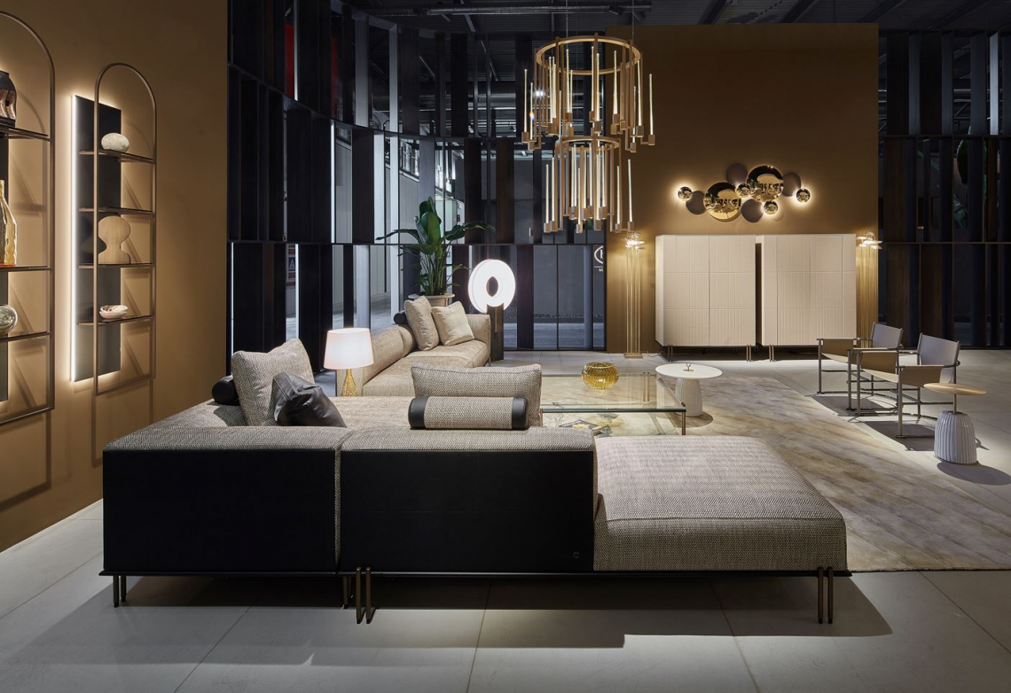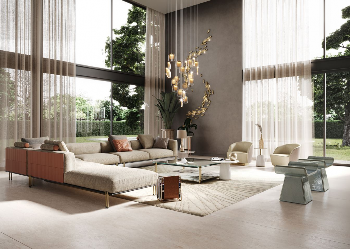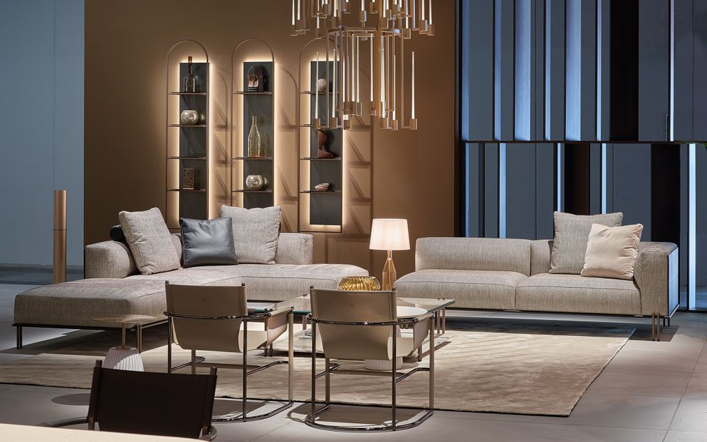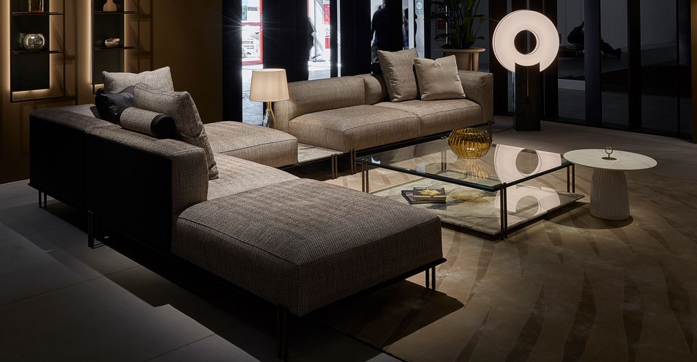 l’abbondante seduta sono il frutto di una costante ricerca nel mondo del living contemporaneo. Cuscinatura sedile e schienale non sfoderabile, realizzata in poliuretano espanso sagomato a quote differenziate. Nel modulo chaise longue con tavolino integrato il piano è realizzato in pietra Pece o in marmo Lunar Breccia.