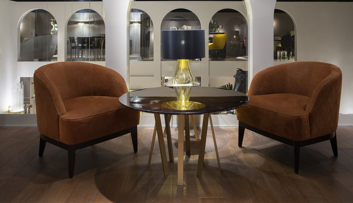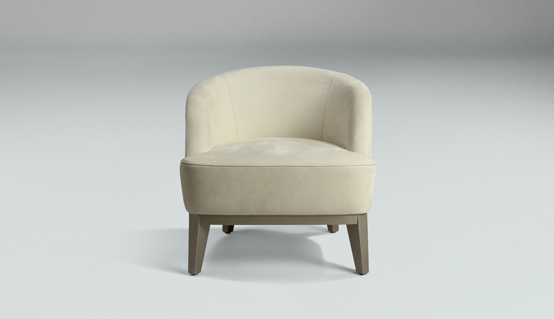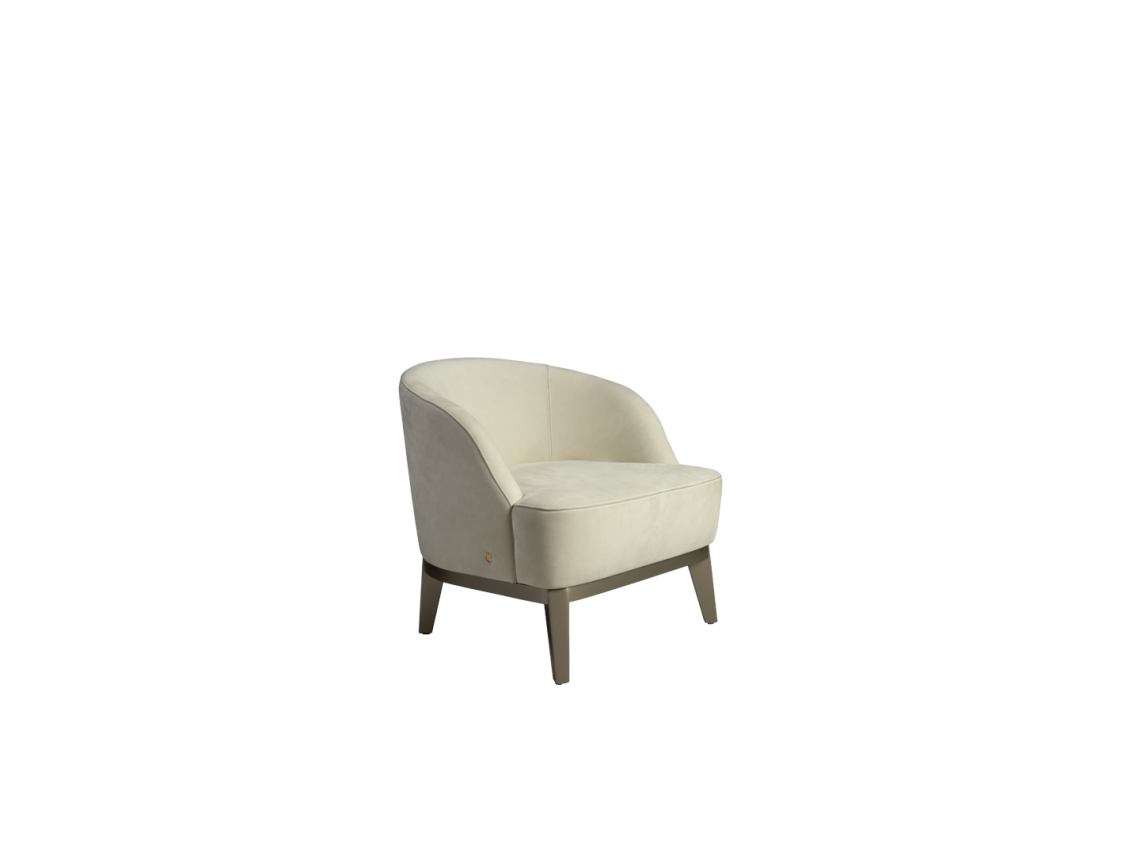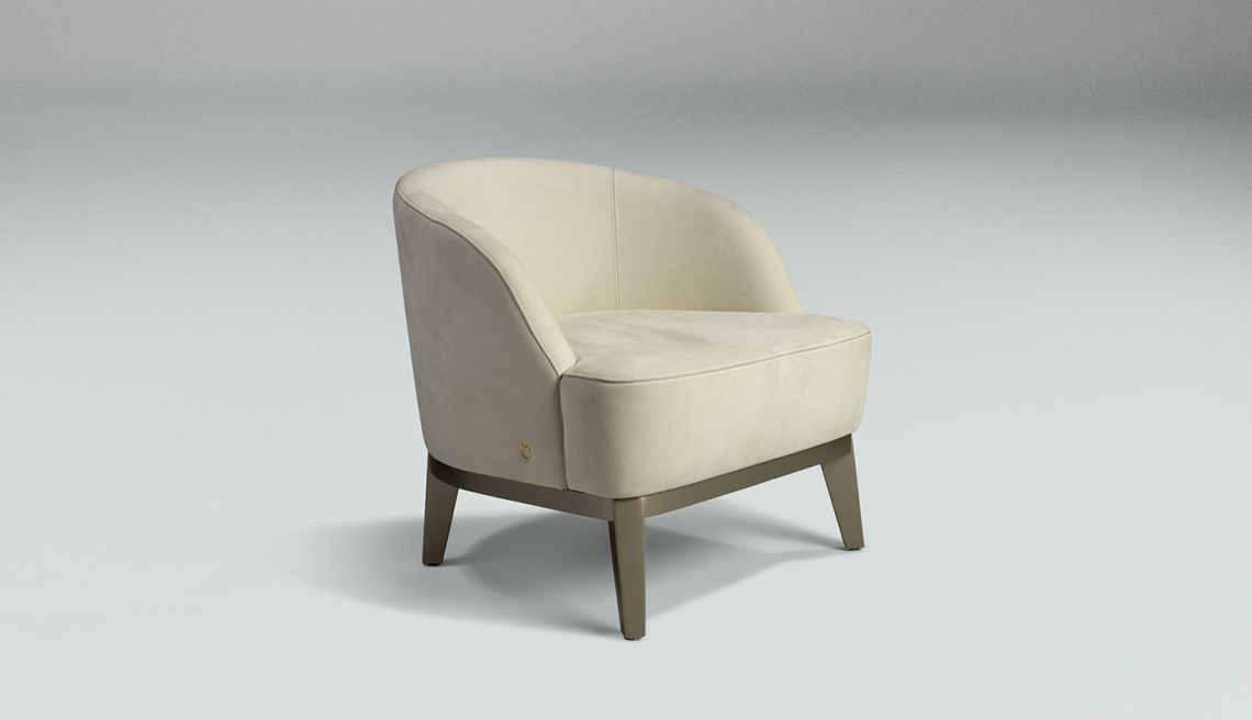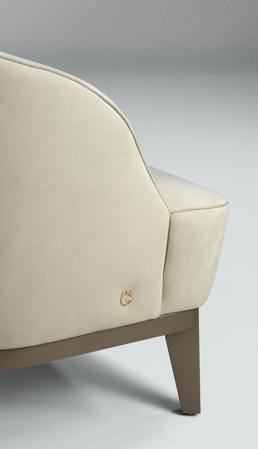 è realizzata con una struttura interna in multistrato di legno curvato con imbottitura in poliuretano a densità variabile. Ha un rivestimento, non sfoderabile, personalizzabile con pregiati tessuti, raffinate pelli bovine pieno fiore e nabuk. La seduta poggia su una struttura in legno laccato con vernice metallica color beige perlato RAL 7035.