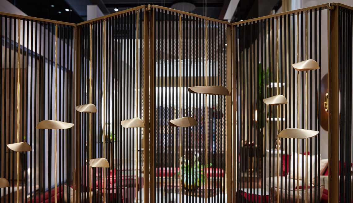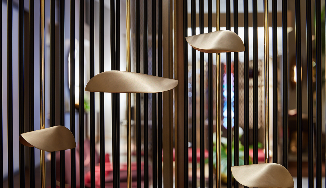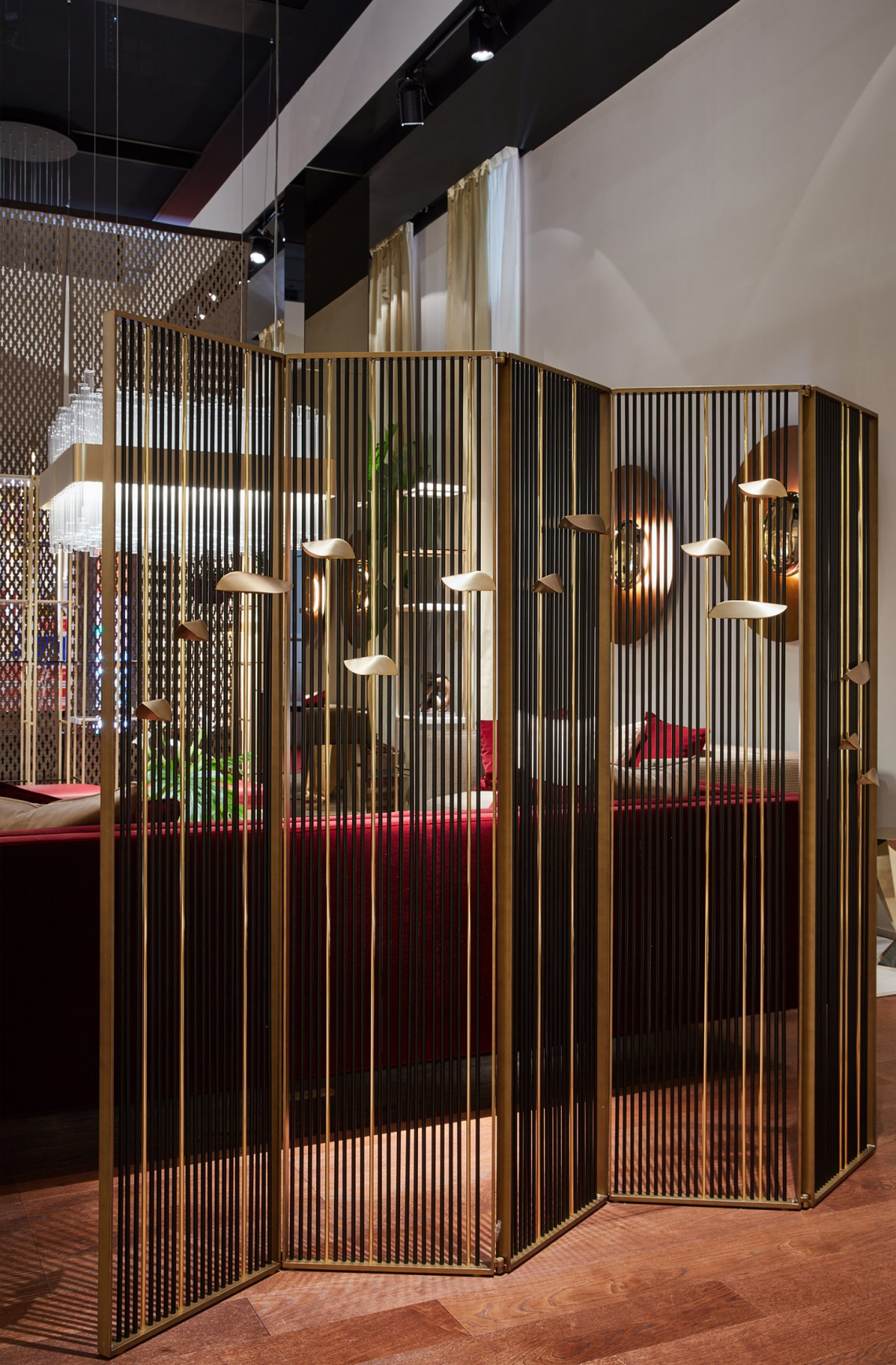Il paravento ha una cornice in metallo finitura bronzo ottone opaco, steli in metallo in finitura brunito opaco e ottone lucido. Nelle aste in ottone sono inseriti elementi decorativi a forma di foglia, realizzati in metallo con finitura oro opaco, realizzati artigianalmente.